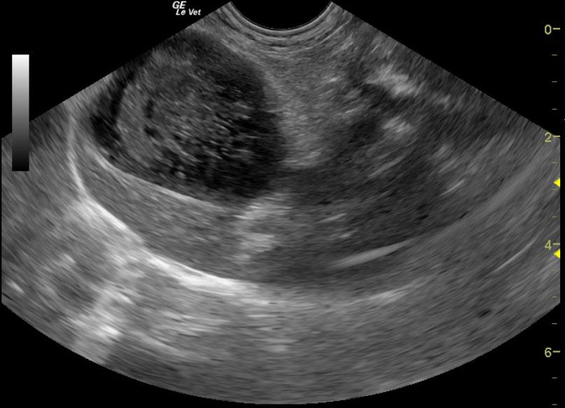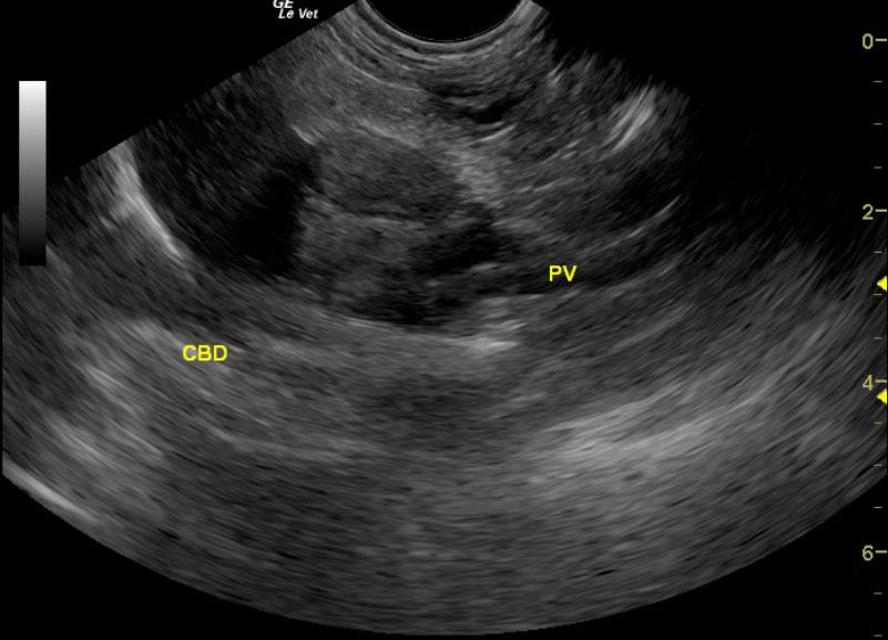 A 12-year-old FS Pomeranian was presented for acute vomiting and diarrhea. On physical examination, dyspnea, coughing, and a heart murmur were present. Urinalysis, T4, coagulation profile, and CBC were all within normal limits. Abnormalities on serum biochemistry were revealed elevated total proteins, globulin, liver enzyme activity, total bilirubin, and azotemia.