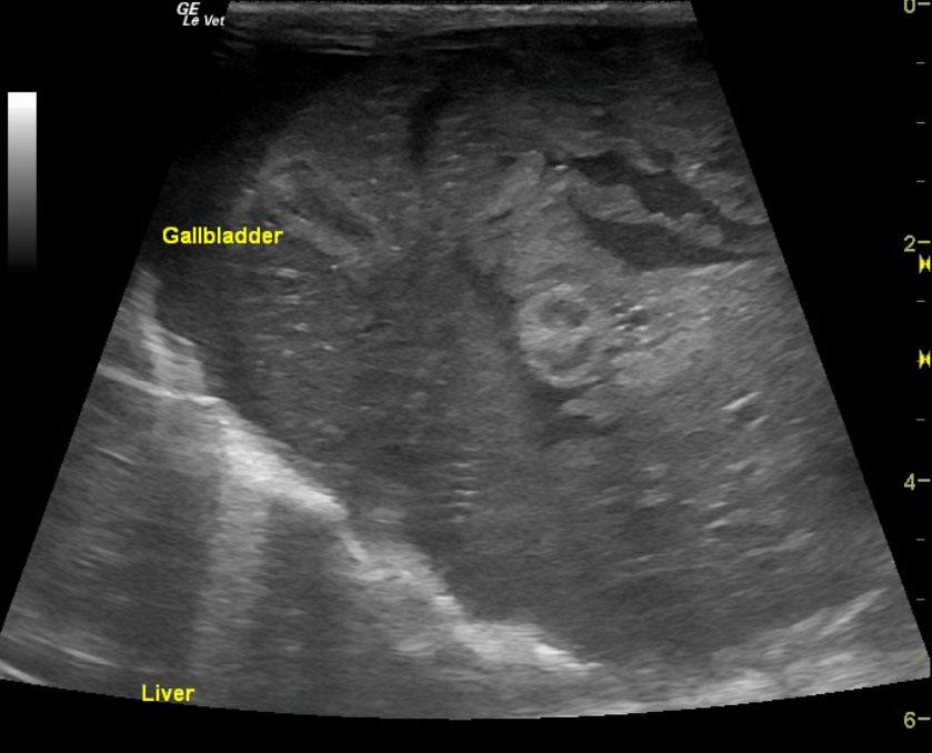 The liver was mildly heterogenous with increased portal markings and coarse architecture. The portal vein was dilated with echogenic debris. However, no evidence for portal hypertension was noted. The portal vein velocity was normal at 25 cm/sec. The echogenic debris within the portal vein was also repeated in the vena cava. This is suggestive for inspissation and a high predisposition for clot formation. The common bile duct measured 0.3 cm. The gallbladder was collapsed and double layered with debris.