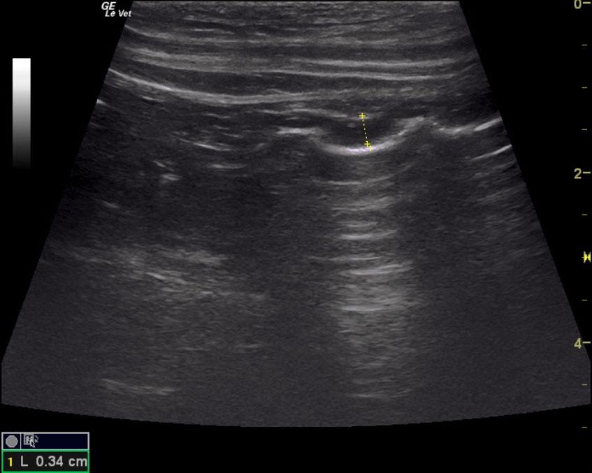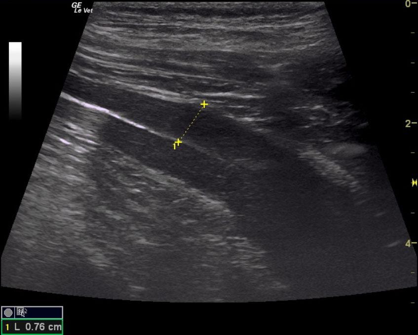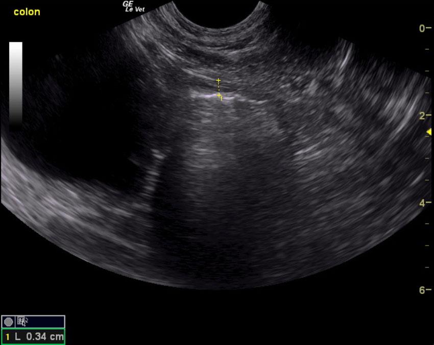 The rectum was thickened with some loss of detail and measured 0.92 cm at the level of the pelvic urethra. The remainder of the intestinal tract was unremarkable.