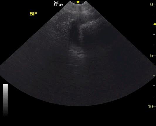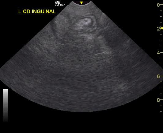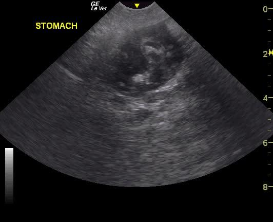 A NM Labrador with a history of foreign body ingestion was presented for intermittent diarrhea that had initially responded to bland diet, metronidazole and aminopentamide. More recently there had vomiting and he appeared uncomfortable. On physical examination, a palpable mass in the cranial abdomen was present. CBC was within normal limits and serum biochemistry showed elevated phosphate low BUN.