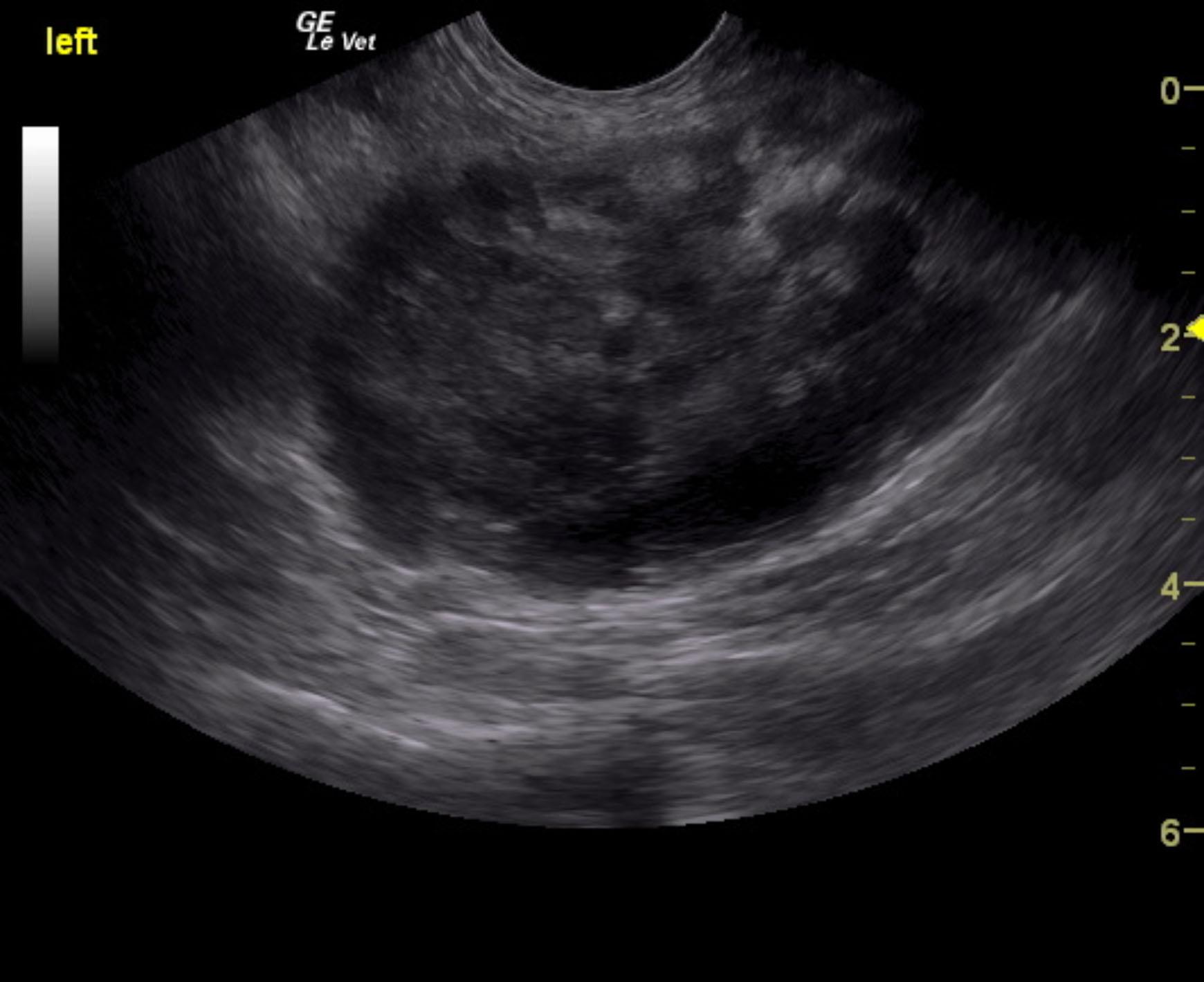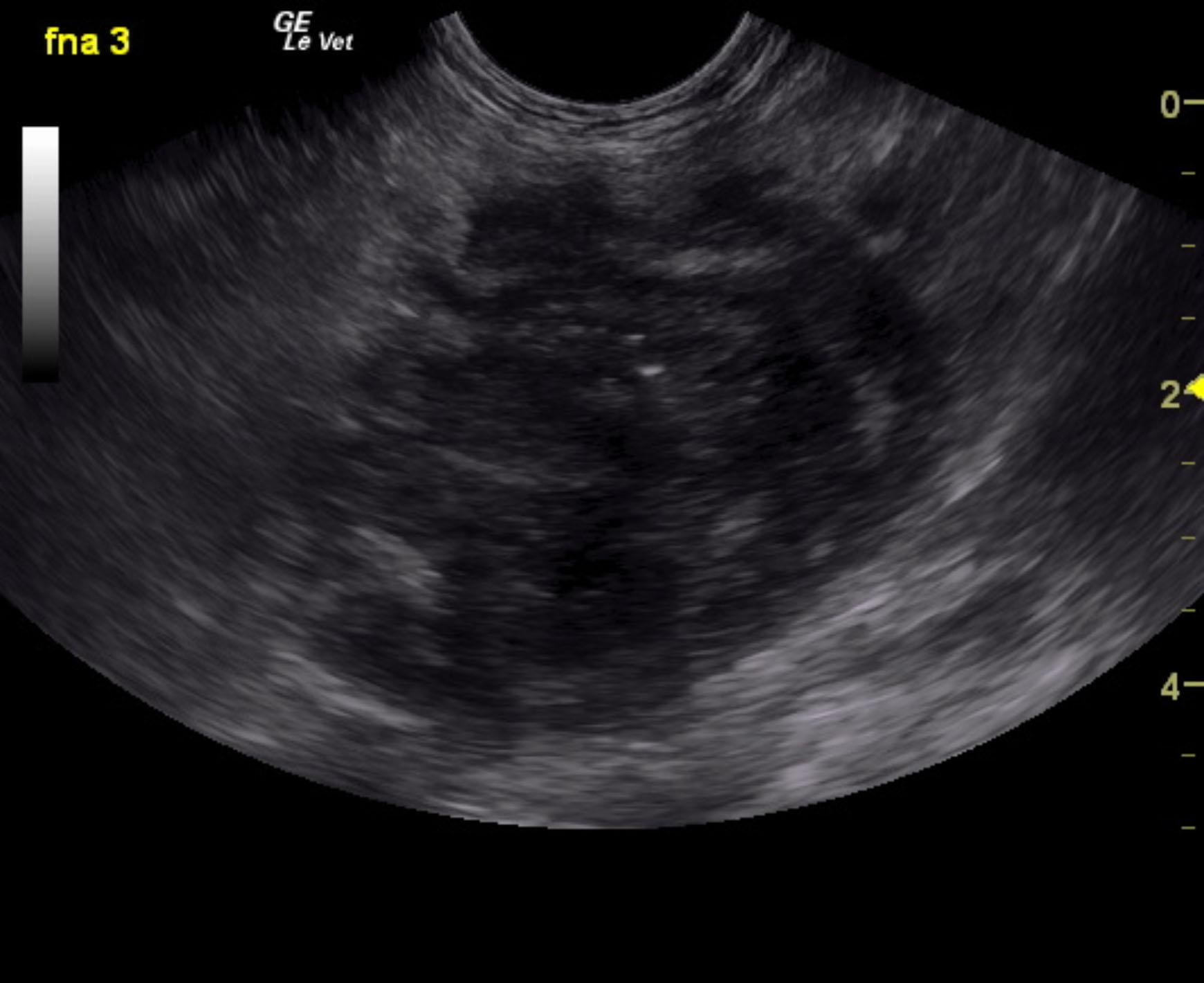 A 16-year-old SF DSH with a history of diabetes and hyperthyroidism was presented for evaluation of vomiting, diarrhea, and anorexia. Urinalysis showed SG of 1.017, proteinuria, and hematuria with negative bacterial growth. Coagulation panel was mildly elevated.