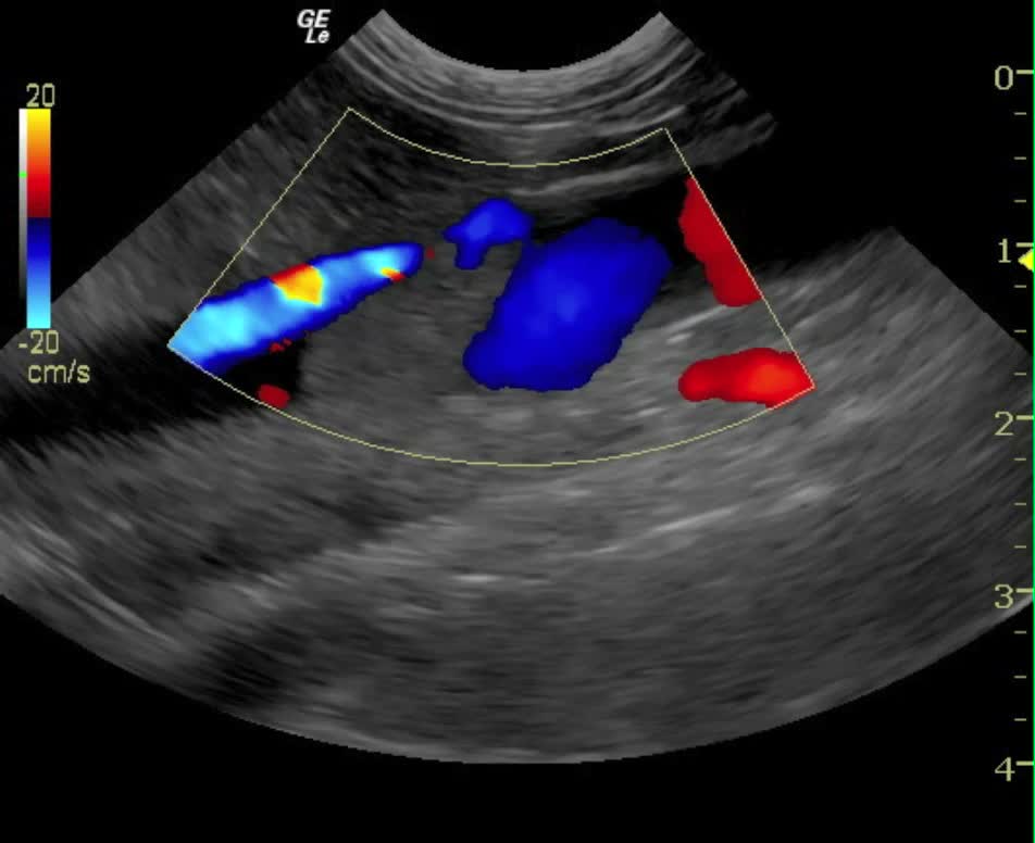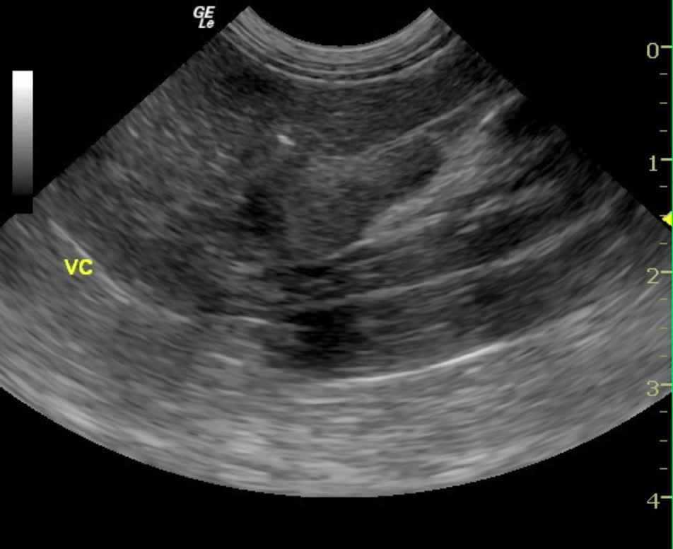 A dog of unknown breed, gender and age, was presented for evaluation of polyuria, polydypsia, and abdominal guarding. No abnormalities were present on bloodwork.