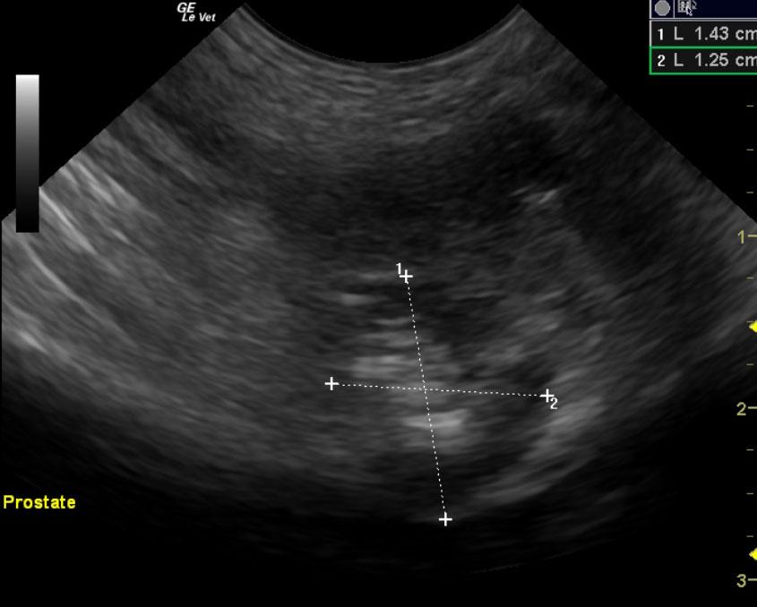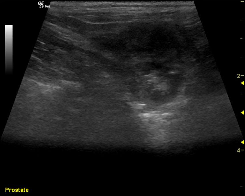 A 7-year-old NM Maltese mixed breed dog was presented for evaluation of severe hematuria. The only abnormality on urinalysis was hematuria.