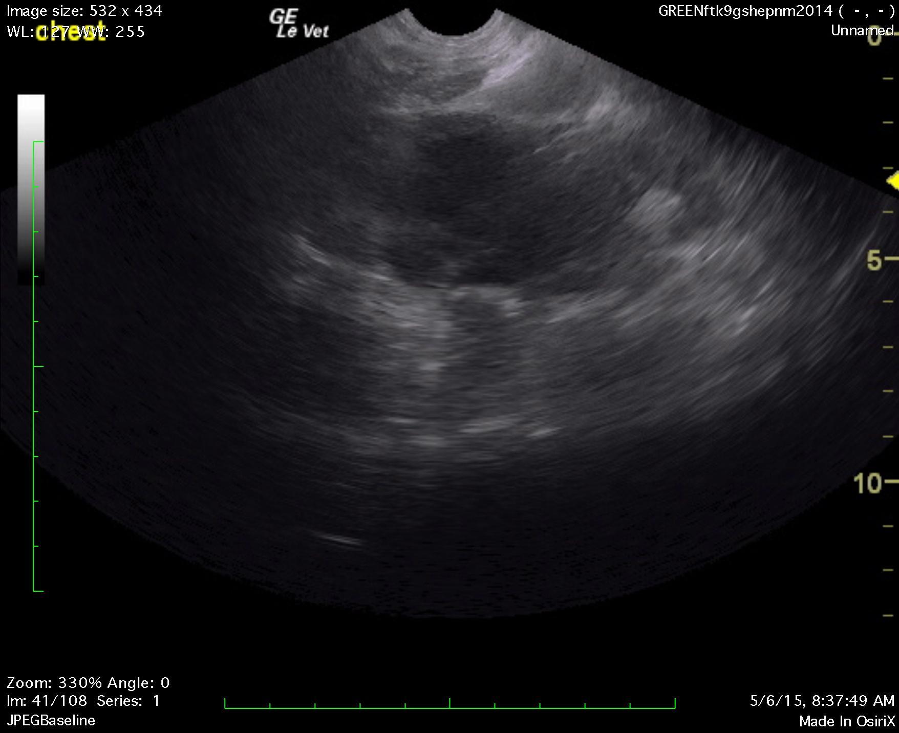 A 1-year-old NM German shepherd with a history of PU/PD and hypercalcemia was presented for evaluation of lethargy, weight loss, and anorexia. Left-sided nephromegaly was present on survey radiographs. Abnormalities on serum biochemistry were hypercalcemia, azotemia, and mildly elevated ALT activity.