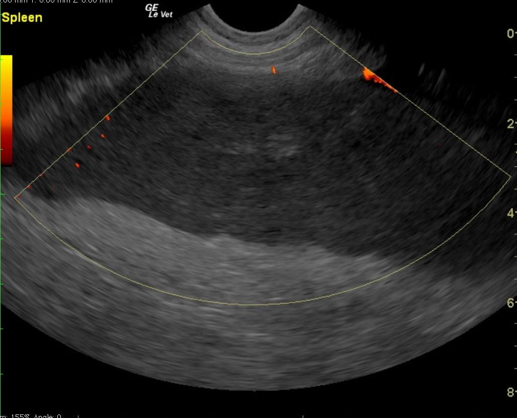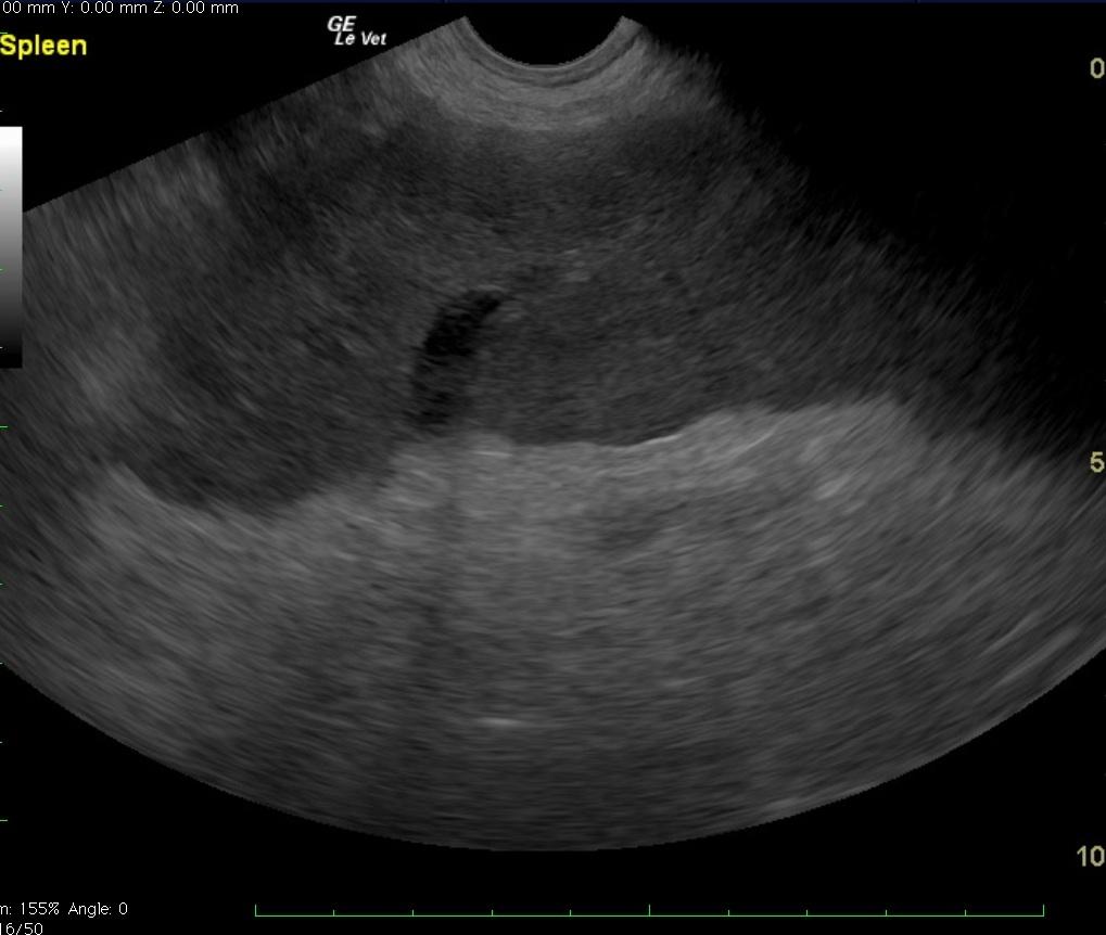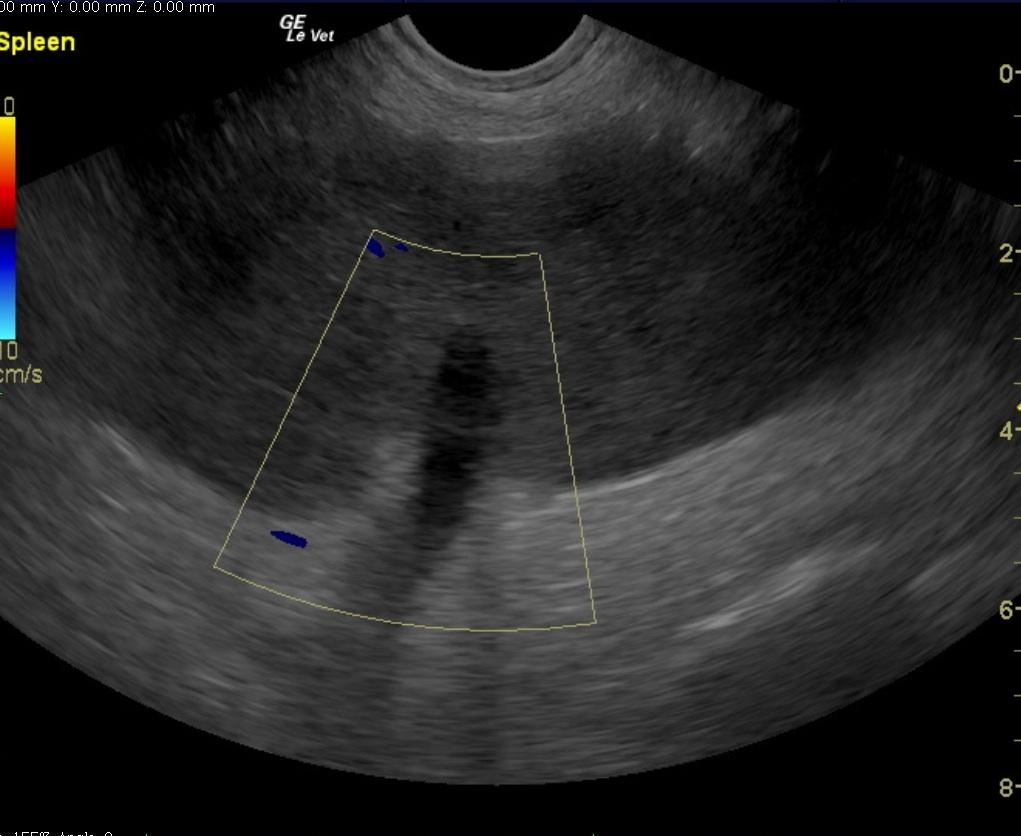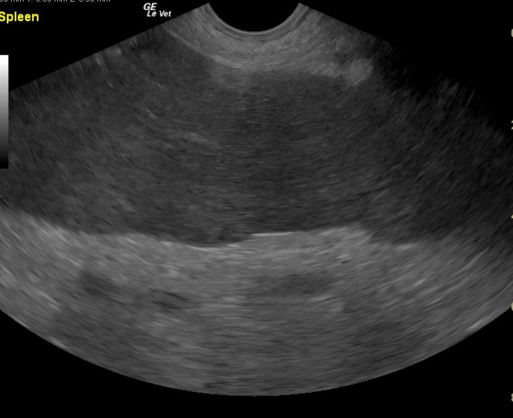 A 6-year-old intact male English Bulldog was presented for 2-3 days of intermittent vomiting and lethargy. Physical exam found the patient to be tachycardic with pale mucous membranes and a palpable mass in the abdomen. Serum biochemistry revealed elevated alkaline phosphatase, hypernatremia, and mild hypochloremia. On CBC, a decreased HCT in conjunction with a high MCV was noted, in addition to a neutrophilia, monocytosis and thrombocytopenia. No abnormalities were noted on thoracic radiographs.