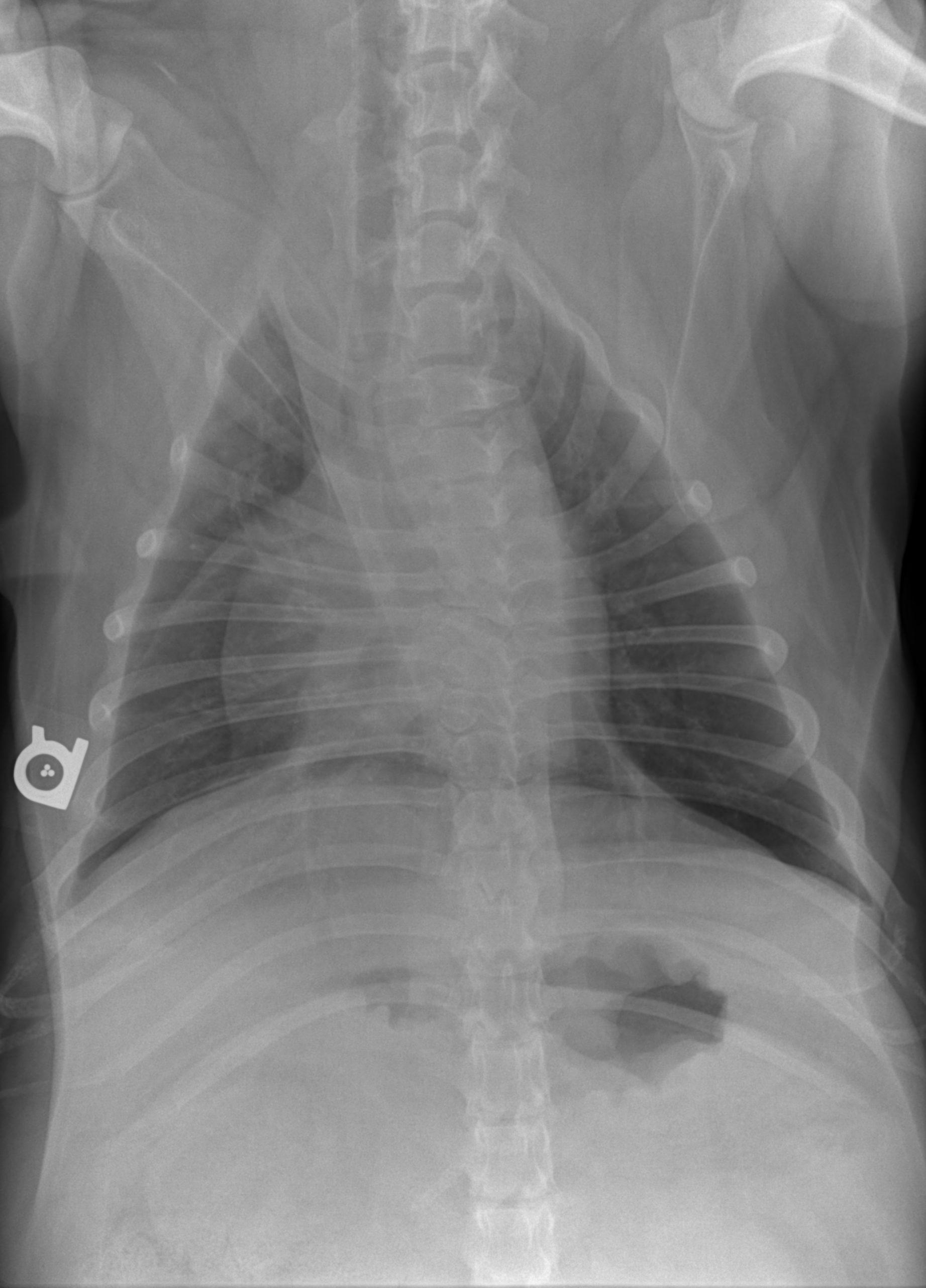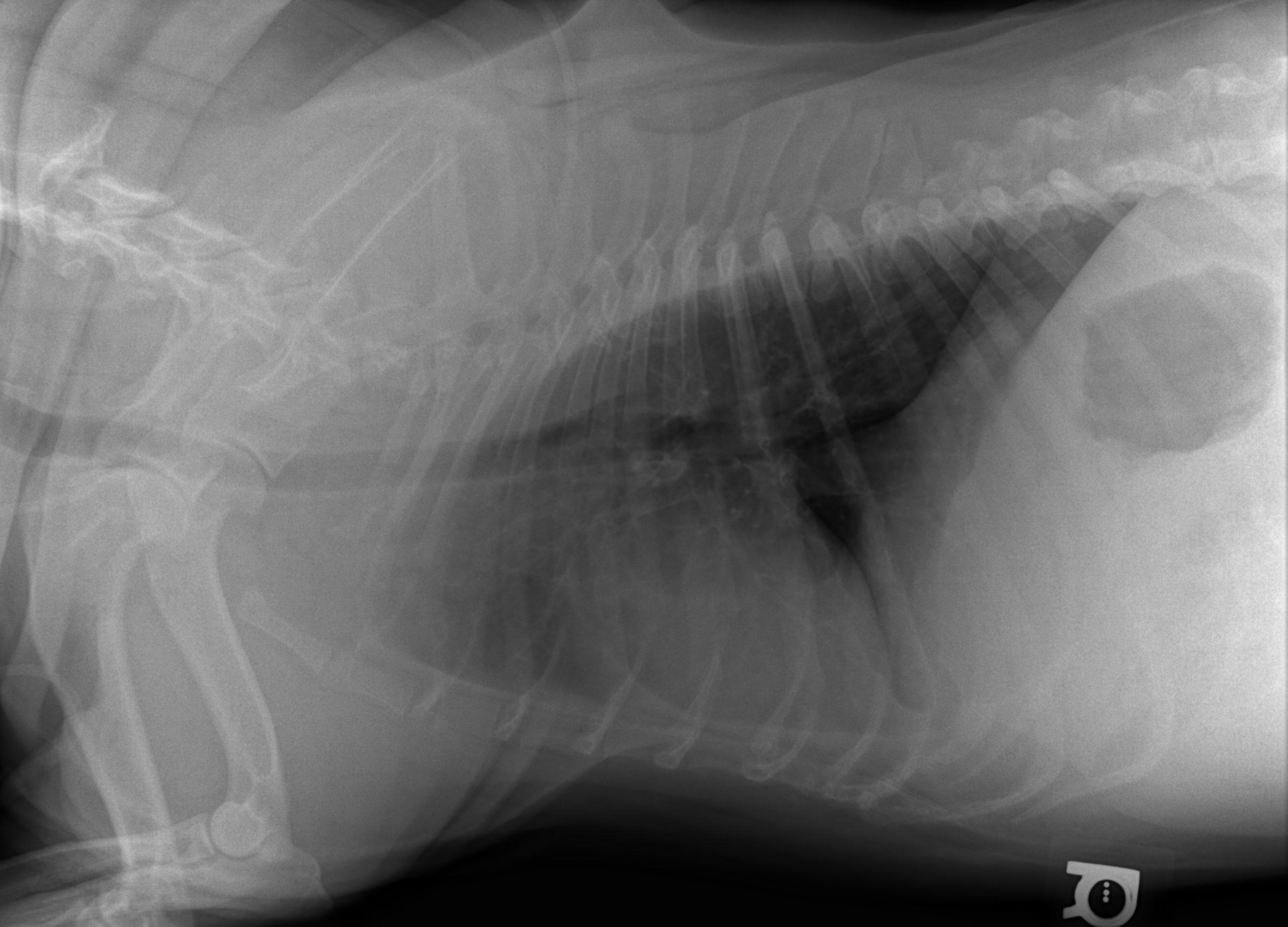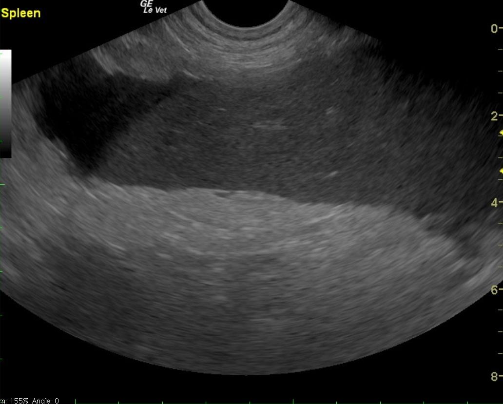 A 6-year-old intact male English Bulldog was presented for 2-3 days of intermittent vomiting and lethargy. Physical exam found the patient to be tachycardic with pale mucous membranes and a palpable mass in the abdomen. Serum biochemistry revealed elevated alkaline phosphatase, hypernatremia, and mild hypochloremia. On CBC, a decreased HCT in conjunction with a high MCV was noted, in addition to a neutrophilia, monocytosis and thrombocytopenia. No abnormalities were noted on thoracic radiographs. Abdominal radiographic findings revealed a loss of contrast in the cranial abdomen, with the possibility of a splenic mass. Radiographic Interpretation showed marked splenomegaly strongly suspected to be secondary to torsion, although accompanying infiltrative or neoplastic pathology could not be ruled out. The small volume of peritoneal effusion and inflammation was likely secondary to the splenic pathology. Thoracic radiographs showed mild microcardia and under perfused pulmonary vasculature in support of hypovolemia. Atypical intrathoracic fat distribution was considered to be incidental in this dog. This dog had multiple hemivertebrae.