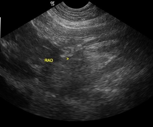 An 8-year-old FS Basset Hound dog was presented for crying throughout the night and vomiting food, fluid, and mucous. On physical examination, she was found to have pink mucous membranes and a normal body temperature. She had bilateral conjunctivitis as well as a bilateral otitis externa (Malassezia). No abnormalities were noted on auscultation of her heart and lungs. The patient was treated symptomatically as an outpatient with anti-emetics and gastroprotectants. Six days later, the dog returned as she was depressed and lethargic. She was in lateral recumbency upon presentation and she was hypothermic with pale pink, tacky and cold mucous membranes. She was admitted to the hospital for I.V. fluid therapy and blood work. The serum biochemical profile revealed elevated ALT, elevated AST, and elevated GGT, azotemia, hyperproteinemia, hyperalbuminemia, hyperglobulinemia, hyperbilirubinemia, hyperkalemia, hypercalcemia, hyperphosphatemia, hypermagnesemia, hyperamylasemia, and an elevated CK. The CBC showed an elevated hemoglobin and leukocytosis consisting of a monocytosis and eosinophilia.