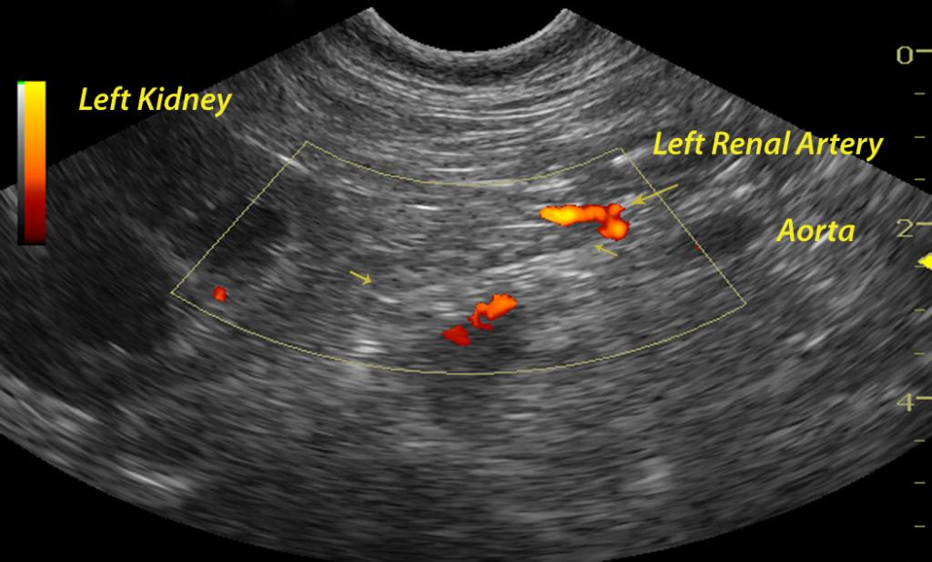 An 8-year-old FS Basset Hound dog was presented for crying throughout the night and vomiting food, fluid, and mucous. On physical examination, she was found to have pink mucous membranes and a normal body temperature. She had bilateral conjunctivitis as well as a bilateral otitis externa (Malassezia). No abnormalities were noted on auscultation of her heart and lungs. The patient was treated symptomatically as an outpatient with anti-emetics and gastroprotectants. Six days later, the dog returned as she was depressed and lethargic.