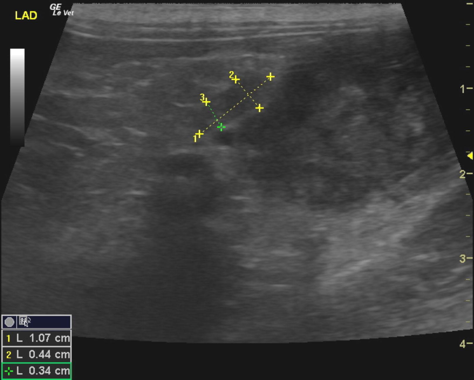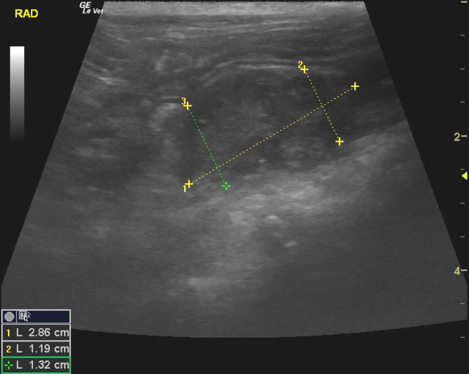 A 7-year-old NM DSH was presented for evaluation of PU/PD and weight loss. Survey radiographs showed small kidneys with mineralization and volume contracted heart. CBC and serum biochemistry showed anemia, hypoalbuminemia, hyperglobulinemia, azotemia, and hyperphosphatemia.