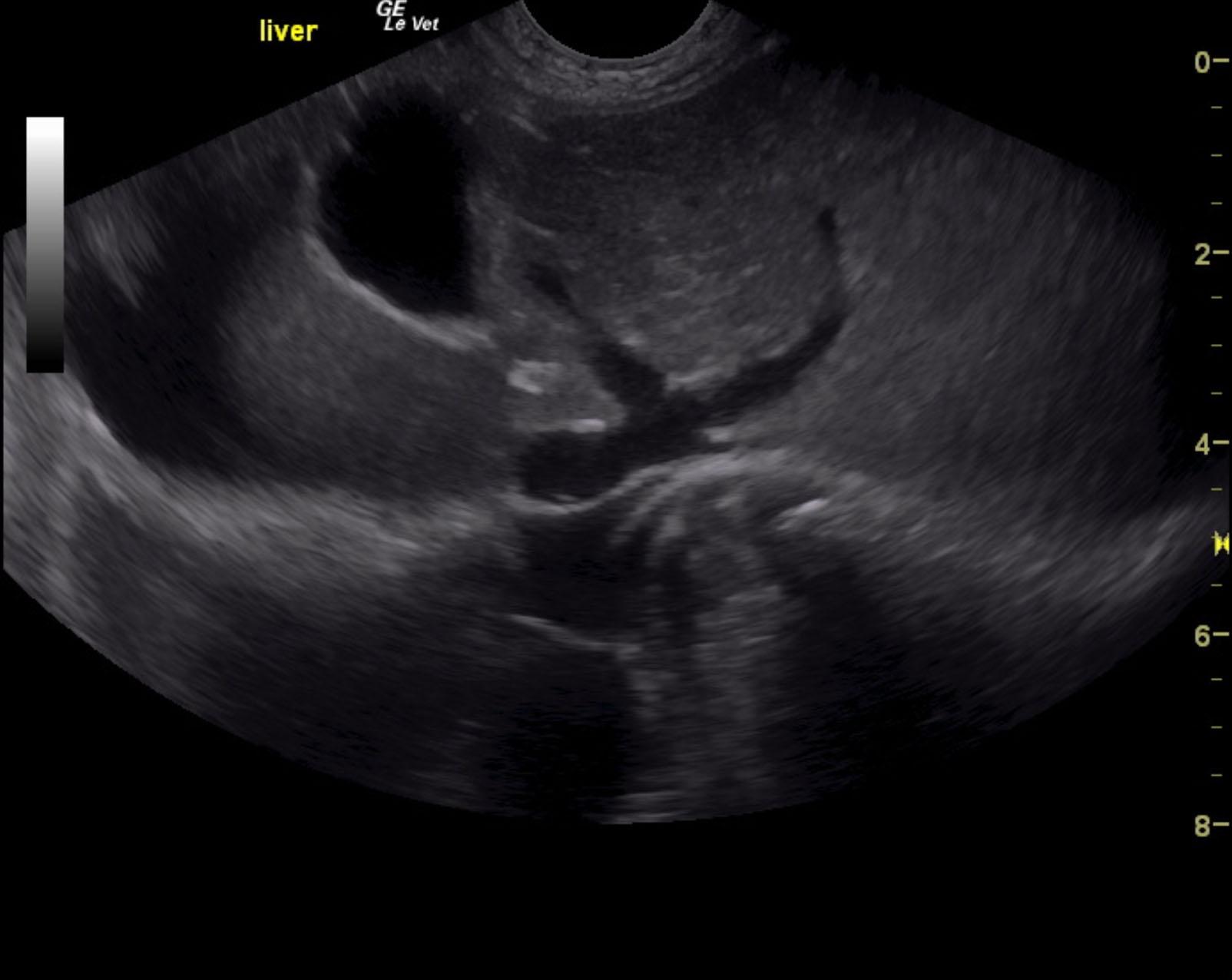 A 13-year-old NM Jack Russell terrier dog was presented for evaluation of PU/PD, decreased appetite, and abdominal distension. Blood work showed mild hypoproteinemia and elevated ALT activity.