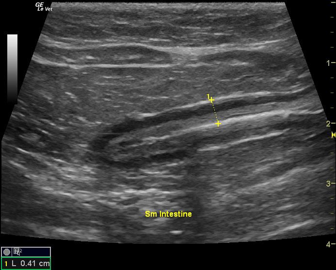 The urinary bladder presented approximately 2.0 cm of mildly shadowing sand and suspended debris. The bladder wall appeared largely normal with minor areas of thickening. The small intestine was thickened.
