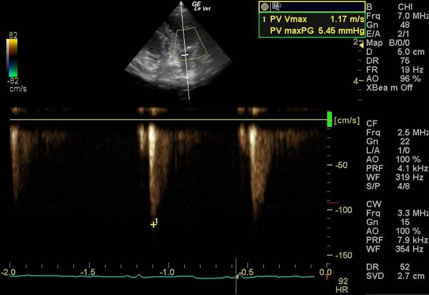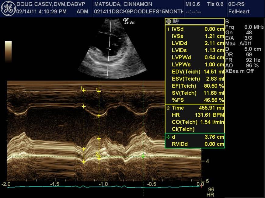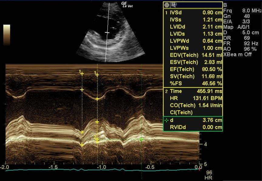 A 1-year-old female spayed toy poodle dog presented for evaluation of bradycardia. Blood pressure was within normal limits. Survey thorax radiographs showed normal size and shape of the cardiac silhouette and left atrium. The vertebral heart sum was 10.2, and a mild interstitial lung pattern was noted.