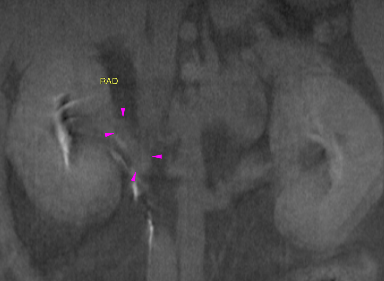 The right adrenal gland assessment is limited by artifacts. However the cranial and caudal pole diameter is less than 0.55 cm. The regular organ architecture is maintained.
