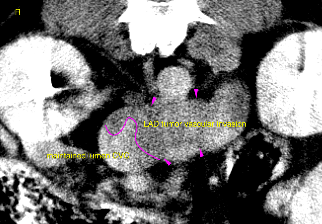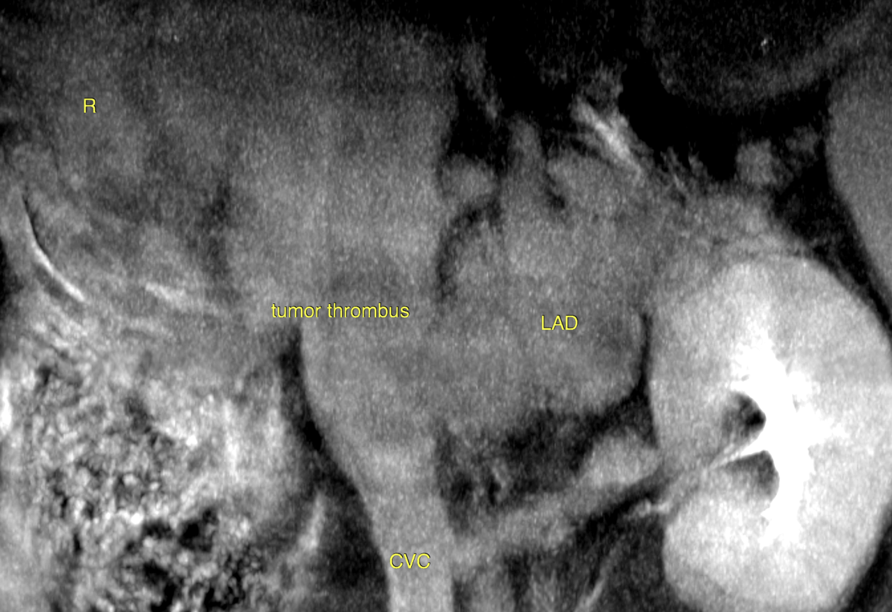 CT of the abdomen – A leftsided polygonal expansile and slightly ill defined adrenal mass of 4 x 3.5 x 4 cm is seen. The mass reveals extensive invasion into the caudal vena cava obstructing 60 % of the vascular diameter and expanding the vascular lumen signifcantly. The intravascular tumor extends at least 7 cm cranial from the right renal vein. Marginal blood flow is maintained. Pooling of contrast caudal to the vascular mass with differential contrast concentration is seen. The mass itself reveals a heterogenous attenuation pattern with non-uniform contrast enhancement. Mild localized retroperitoneal effusion and fat stranding is noted surrounding the mass.