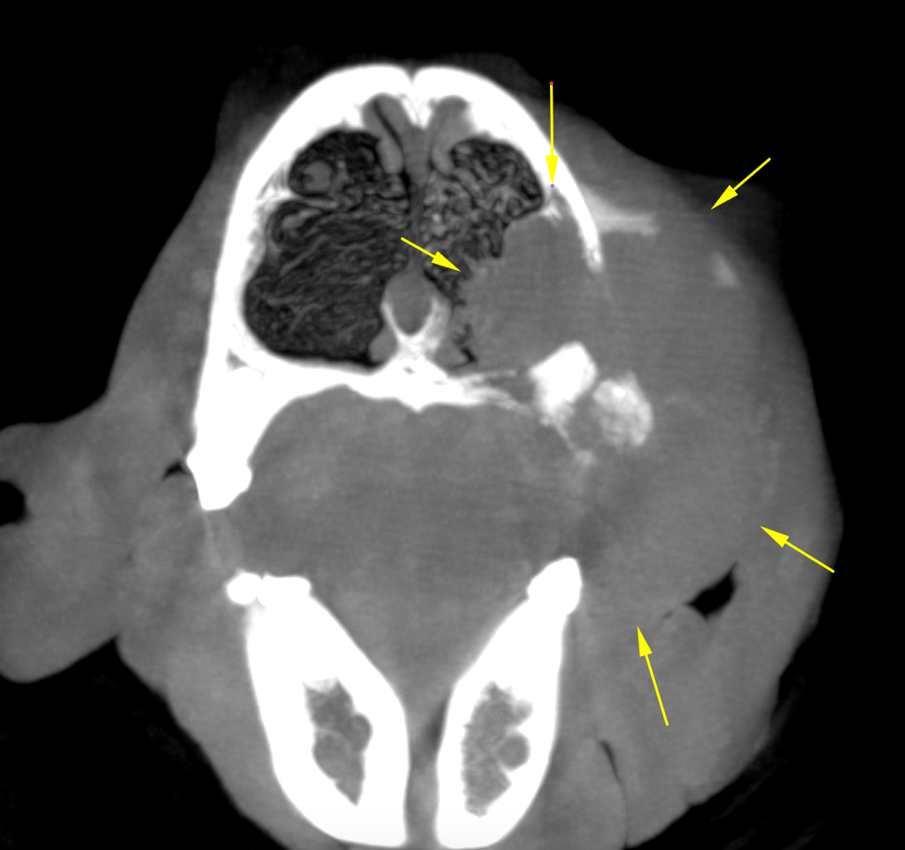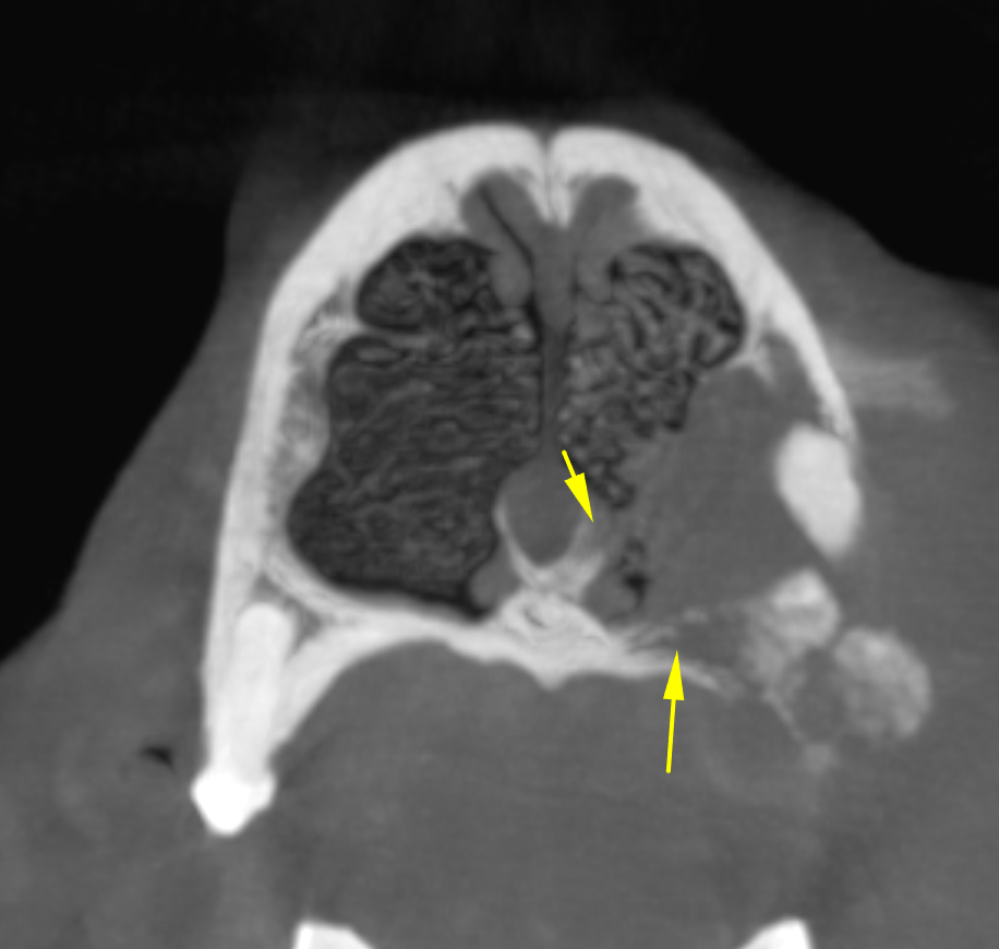Emerging infiltration of the vomer bone is suspected.Differential diagnoses for the mass include squamous cell carcinoma, melanoma, fibrosarcoma, and lymphosarcoma as well as acanthomathous epuli.