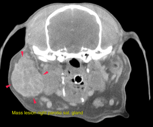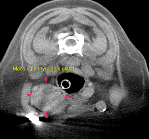 Differential diagnosis for the salivary gland mass includes primary soft tissue neoplasia (fibrosarcoma) with invasion of the parotid salivary gland or – even though rare in canine – primary neoplasia of the parotid salivary gland (such as adenocarcinoma or less likely adenoma).For further workup – if not performed yet – FNA samples or biopsy are essential. Surgical excision is advised. The right thyroid gland presents a mass lesion compatible with primary neoplasia. Possible differential diagnosis are cystic adenocarcinoma or less likely adenoma. In dogs these are rarely functional. Surgical removal of the right thyroid is the therapy of choice. FNA samples from the right superficial cervical lymph node are essential prior to surgery for complete staging. The findings of the right adrenal gland are consistent with primary neoplasia. Possible differentials include functional/non-functional adenoma or adenocarcinoma, pheochromocytoma. Invasion of the phrenicoabdominal vein is likely, invasion of the caudal vena cava cannot be ruled out. The potential of vascular invasion increases the odds of a primary malignancy.