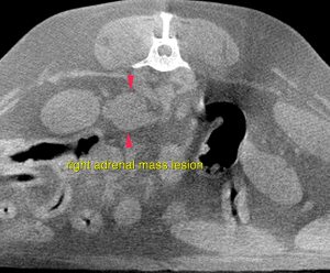 The caudal pole of the right adrenal gland presents a nodular, moderately irregular contrast enhancing, mass lesion measuring 1.7 x 1.9 x 2.0 cm in size. A mass effect on the caudal vena cava is noted.