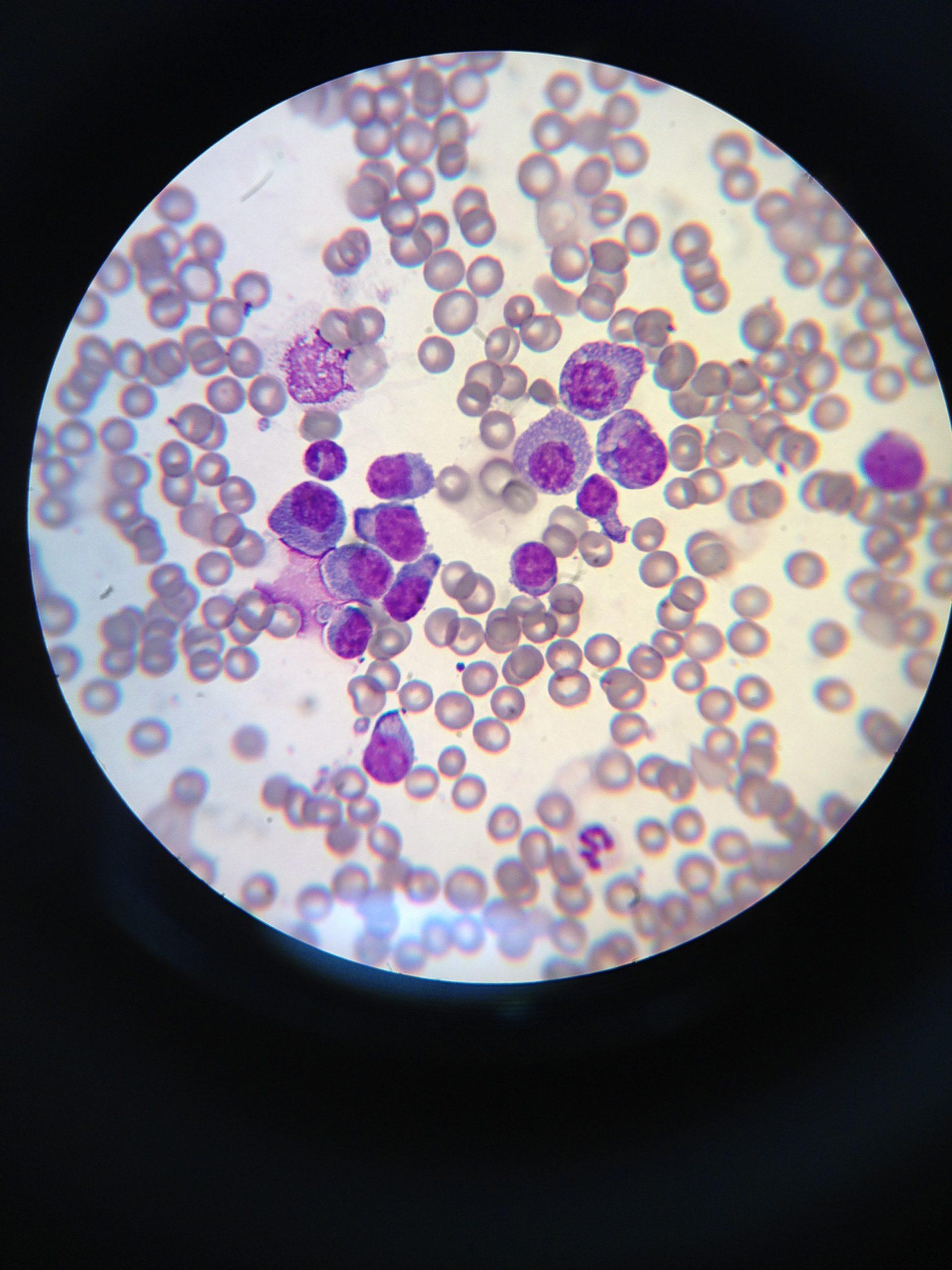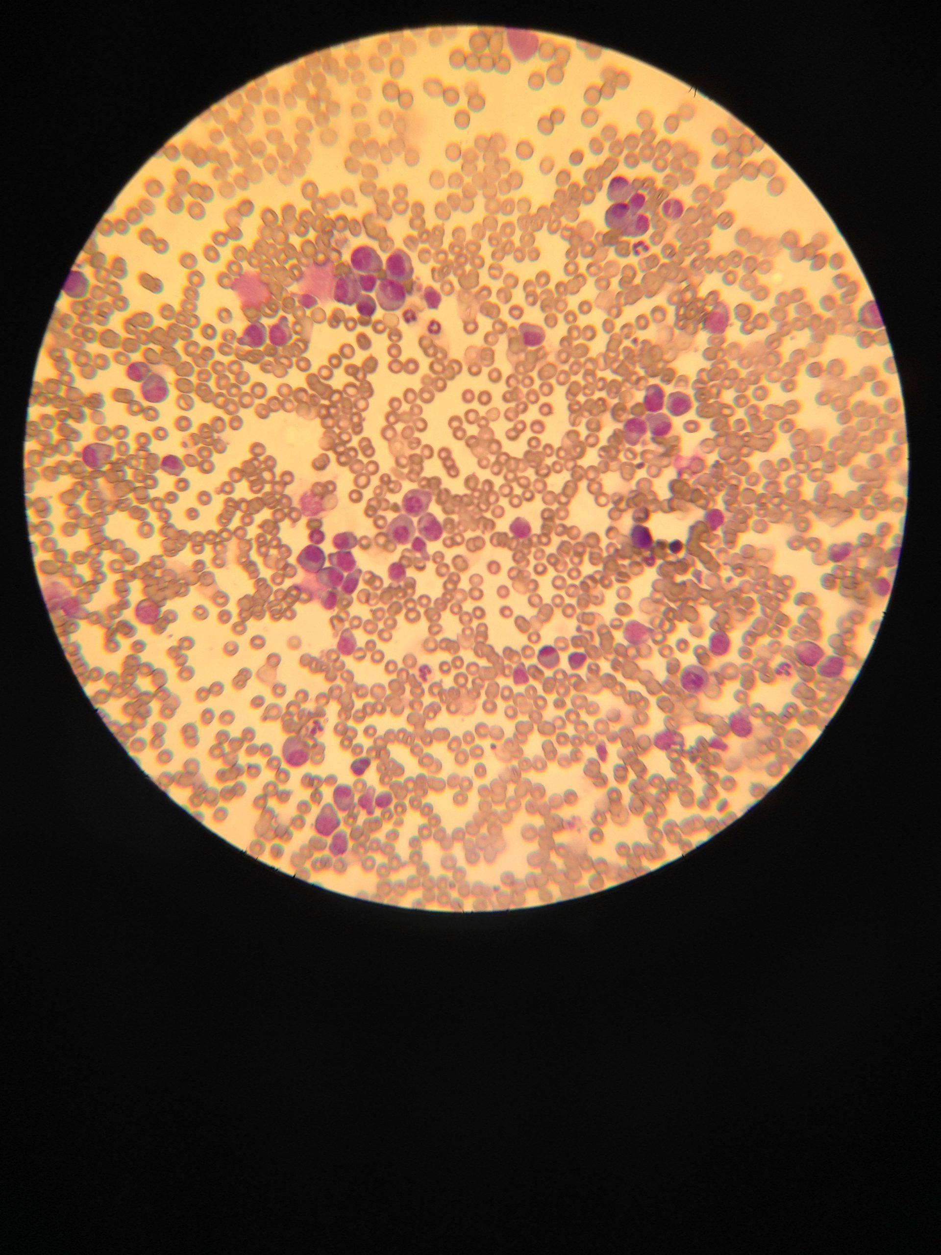 Lymph node: These images demonstrate excellent collections of rounded cells. The rounded cells demonstrate large nuclei that are 2 to 4 times the size of red blood cells. Almost all of these cells have bluish gray cytoplasm with an eccentric nucleus. Occasional nuclei have nucleoli. Some of the cells are small mature lymphocytes but the majority appear to be large. Some of the cells have the appearance of plasmacytoid cells.