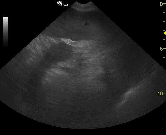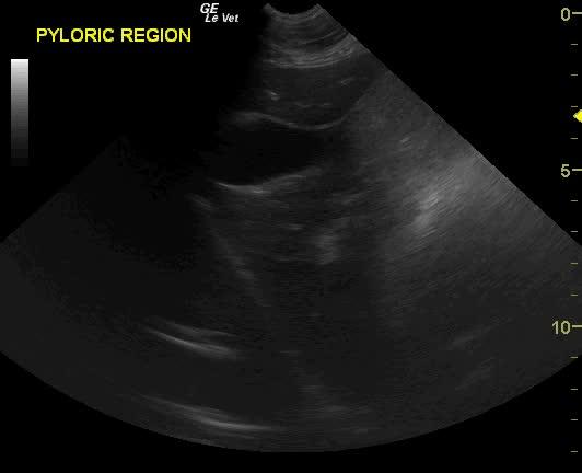 Severe gastric air artifact is noted when imaging the stomach. The normal pylorus is not visible from the right 11-13 intercostal approach suggestive for pyloric displacement. Splenic congestion and splenomegaly is present.