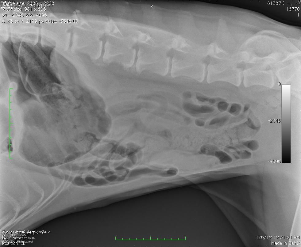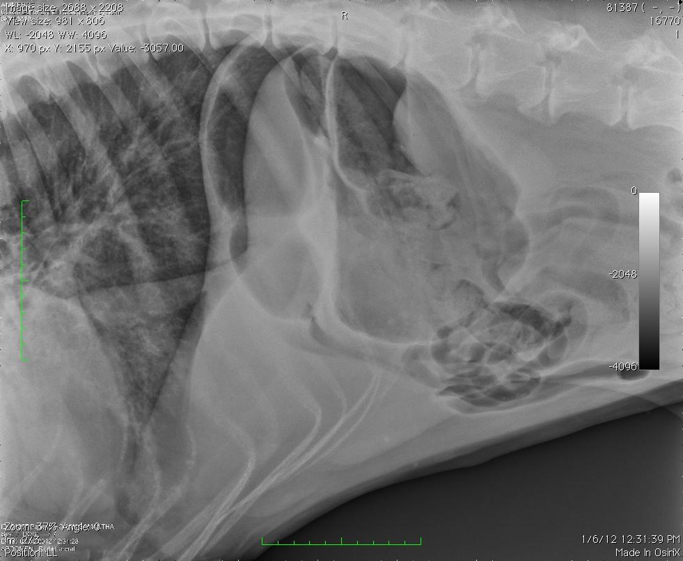 An 8-year-old FS Great Dane dog with a history of urinary tract infection and VPCs was presented for evaluation of lethargy and weakness in the hind limbs. Elevated ALP activity and BUN was present on serum biochemistry.