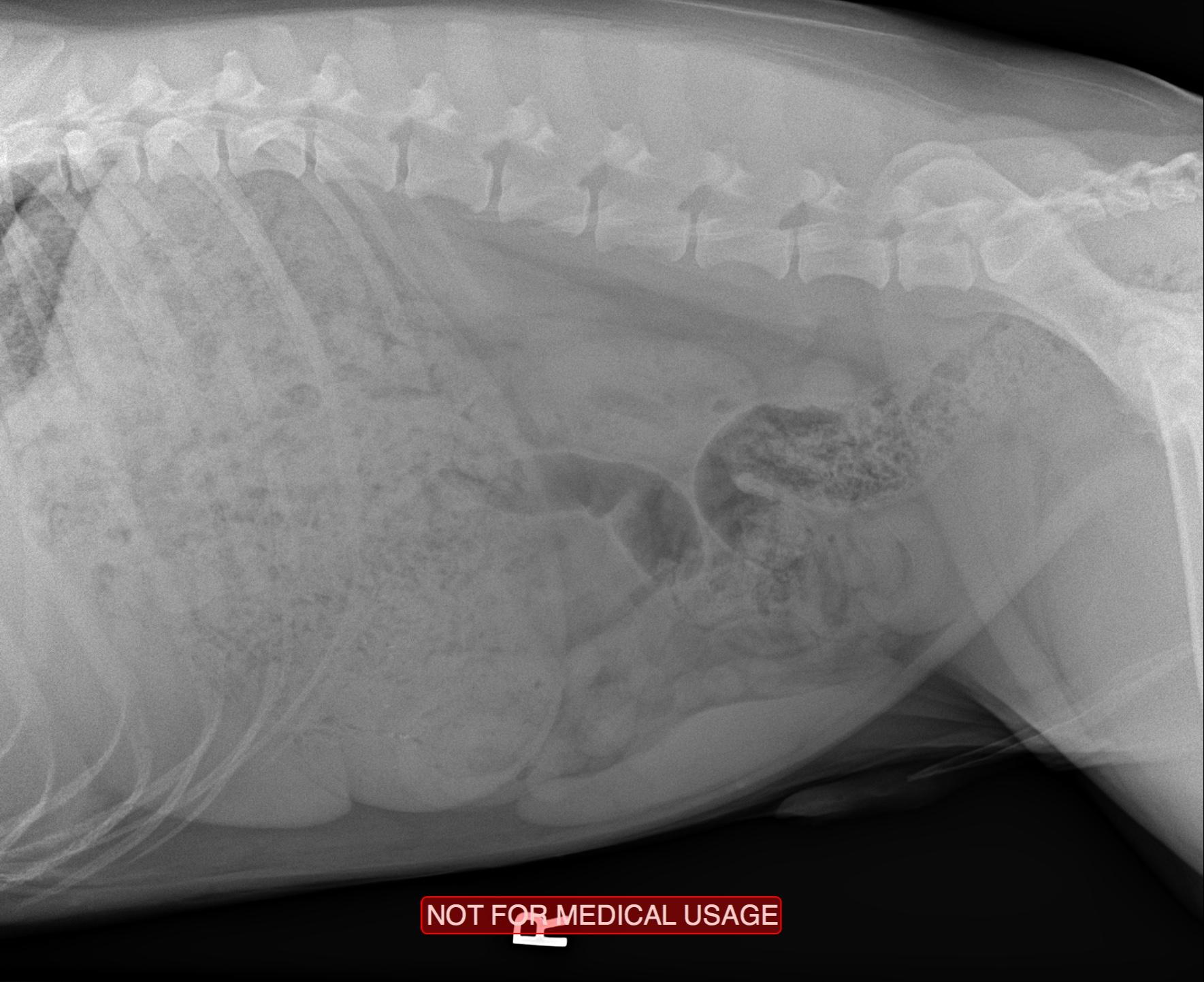 A 2½-year-old MN Labrador was presented for evaluation of one episode of vomiting and a distended abdomen. Abnormalities on physical examination were abdominal distension and tachycardia. CBC was within reference range; whereas low BUN, hypokalemia, and hypochloridemia were present on serum biochemistry. 4dx was negative.