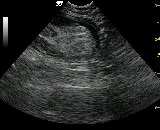 The imaged intestine showed a moderate to markedly, uniformly thick wall, which was hypoechoic with loss of wall layering (Videos 1 & 2.) The intestinal serosal layer was smooth and uninterrupted. The affected segment of bowel was mildly distended with echogenic material. A fusiform, hypoechoic focus with subtle layering was present in the center of the lesion. Video 3 demonstrates the location of the lesion at the level of the bladder trigone, continuing into the pelvic inlet; this is indicative of colonic involvement. An intussusception secondary to primary bowel wall disease was suspected.