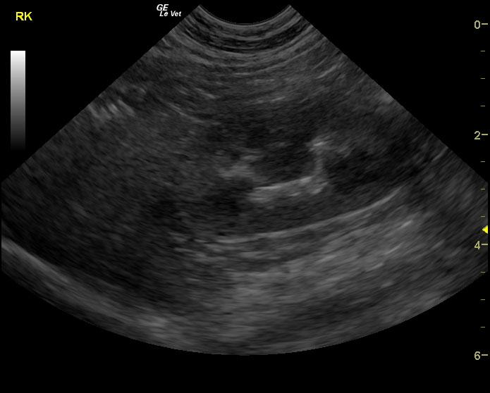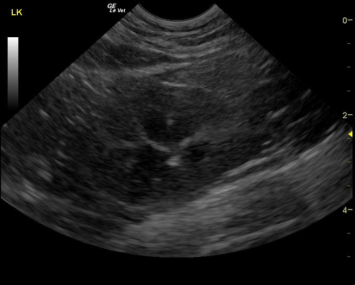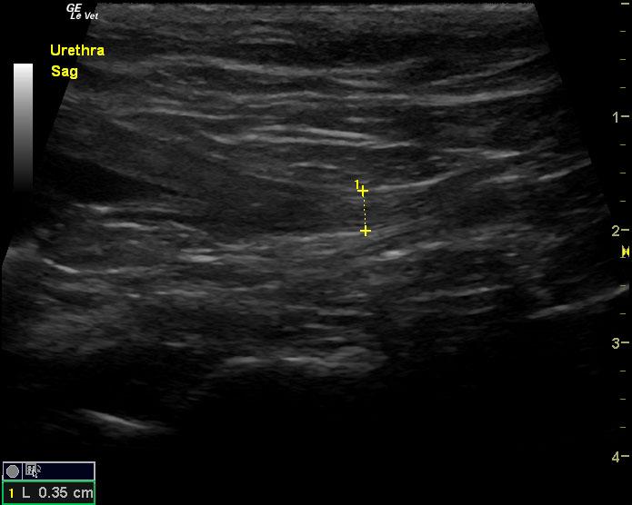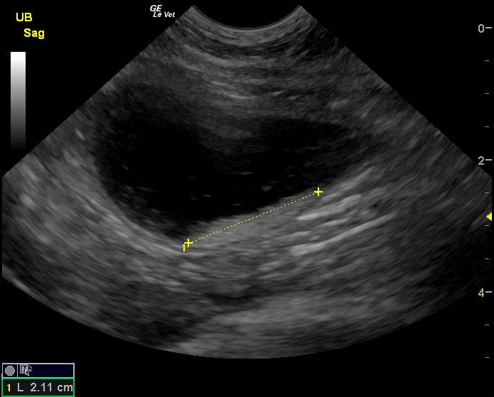 The urinary bladder in this patient revealed dependent debris that measured 2.1 cm in length. The bladder wall presented minor, apical ventral wall thickening. Suspended debris was also evident. The bladder wall thickening appeared to be concentric throughout with some loss of mural detail, and measured 0.4 cm at minor repletion. The pelvic urethra was also thickened. These images are most consistent with interstitial cystitis with minor potential for bladder lymphoma. The kidneys revealed largely normal size and structure; corticomedullary definition and ratio (cortex 1/3 of medulla) were essentially maintained with minor loss of curvilinear pattern. The cortices presented largely uniform texture with some echogenic changes that are not likely of clinical significance at this time.