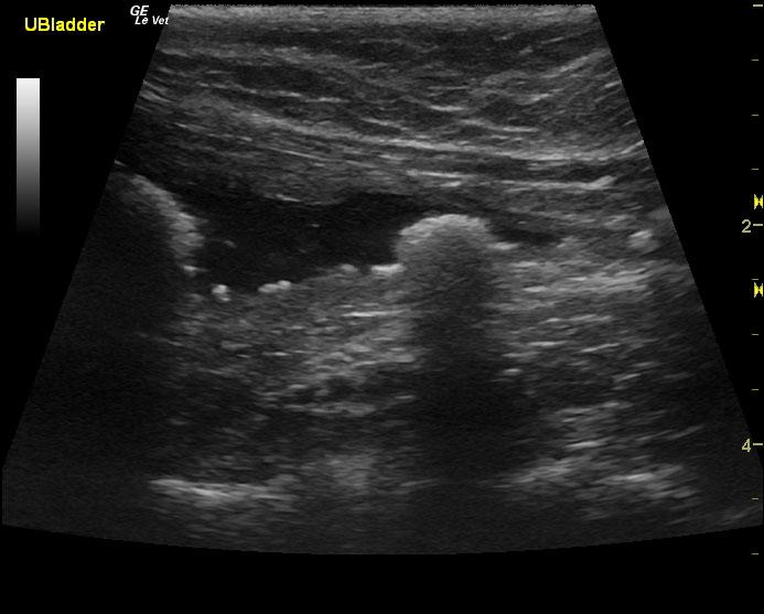 A 7-year-old FS DSH was presented for evaluation of recurrent hematuria and stranguria. Urinalysis showed protein and blood and a normal specific gravity. Culture was negative.