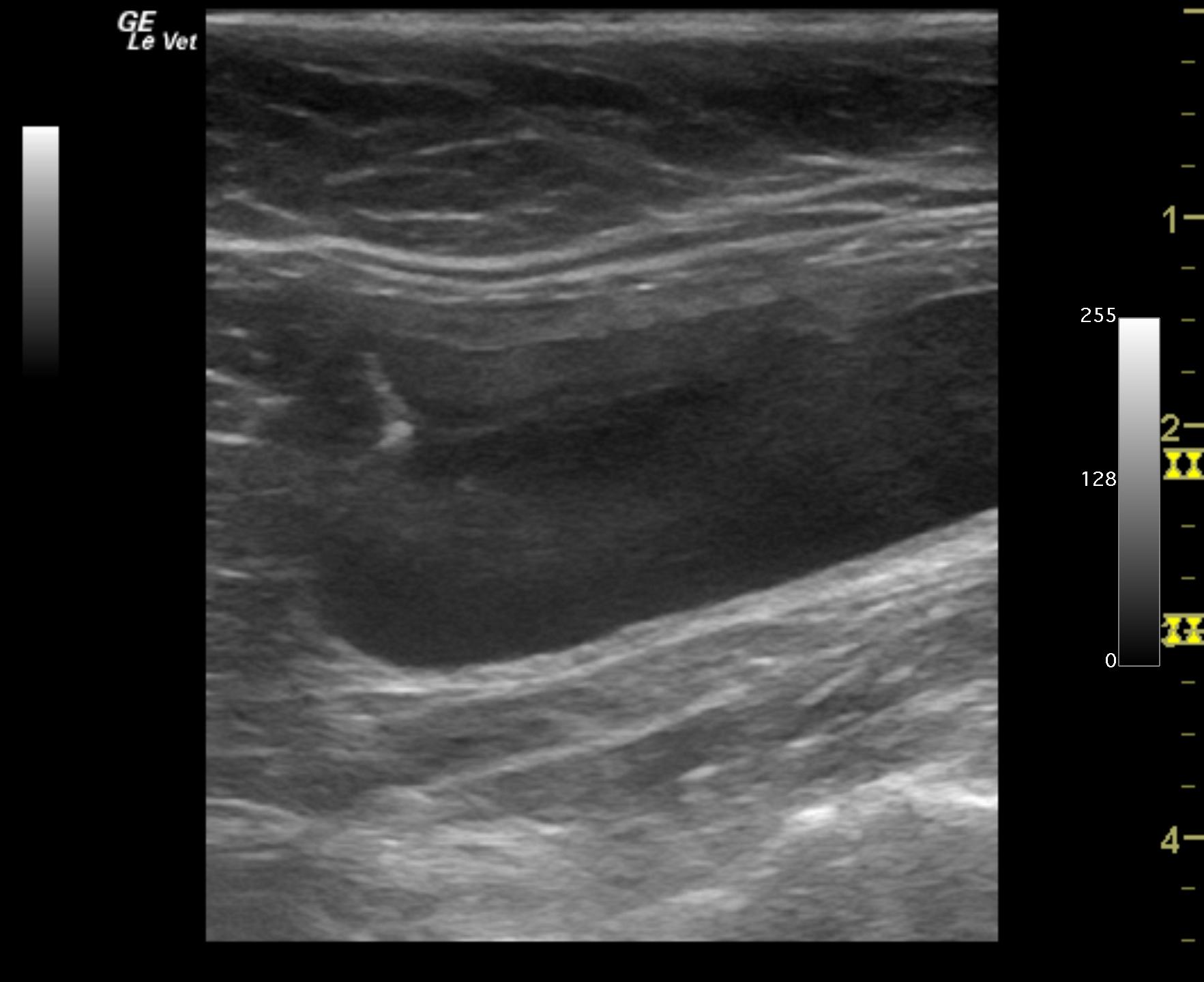 Urinary bladder presented ventral apical wall thickening measured 0.48 cm with minor amount of sand accumulation and slight calculi formation. An ulcerative type lesion in the apex of the bladder wall was noted. No obstructive disease noted at this time.