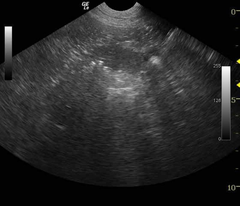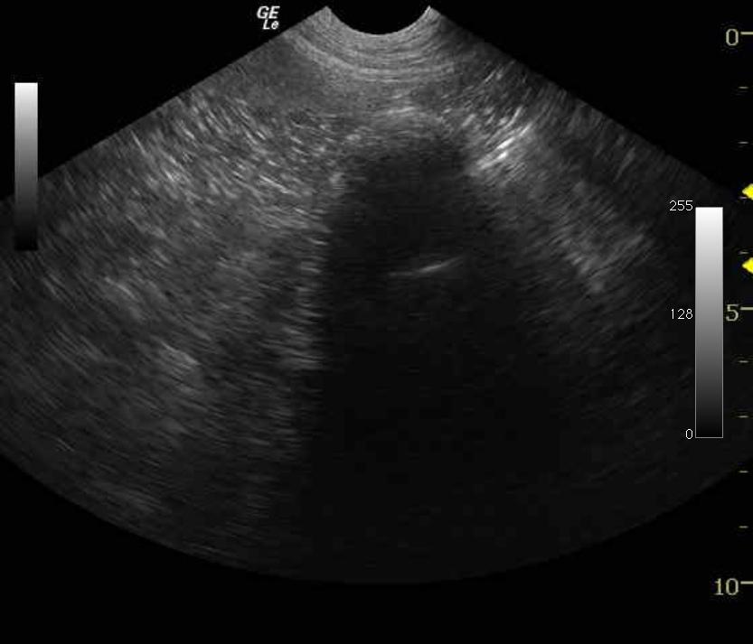 The gastrointestinal tract revealed a significant dilation of the stomach and distal small intestine with fluid material. Small intestinal obstructive material was noted measuring approximately 3.5 cm with areas of adhesion in the region caudal to the spleen. The presence of empty small intestine with dilated small intestine in the same view comprises an obstructive pattern.