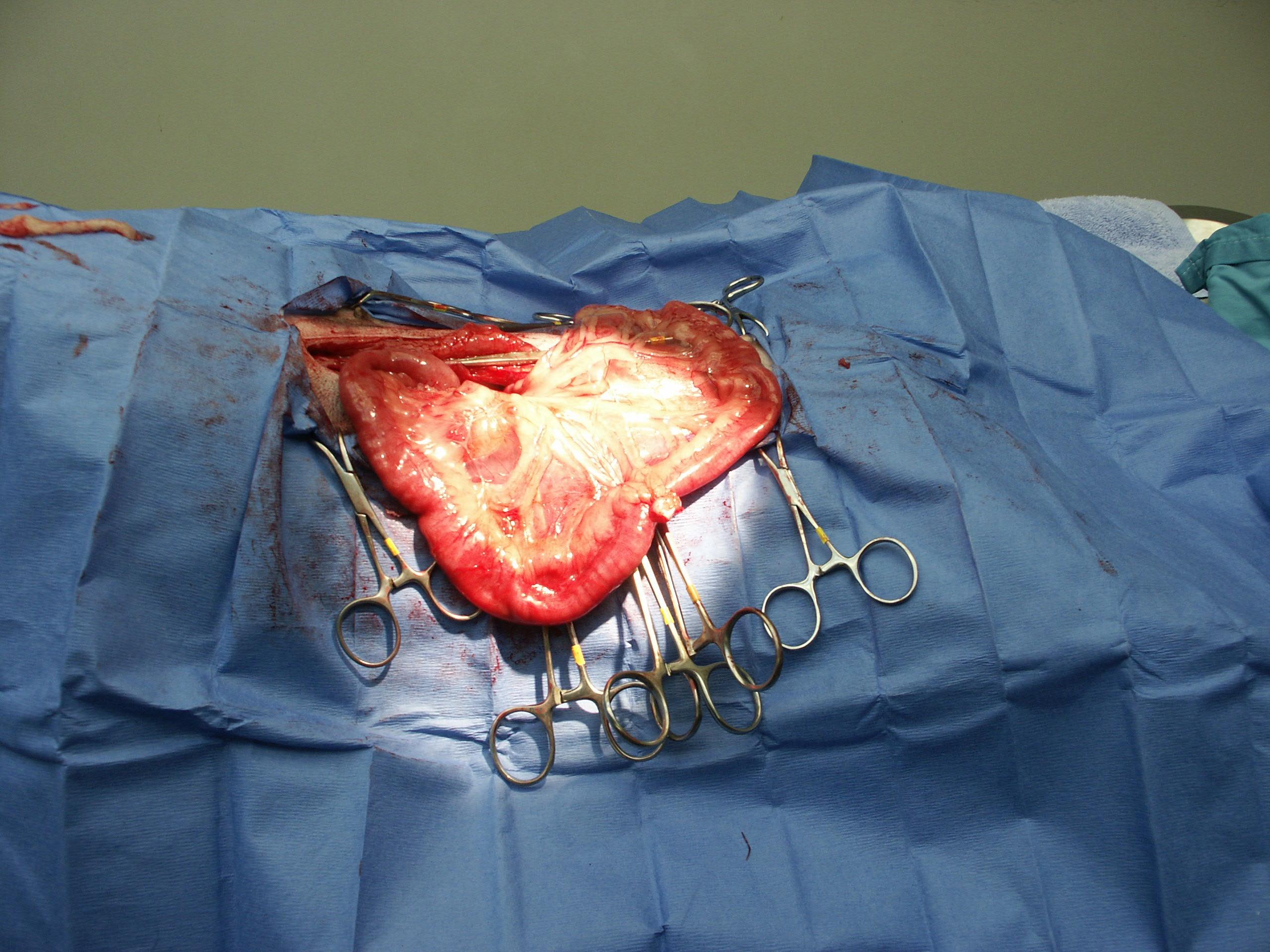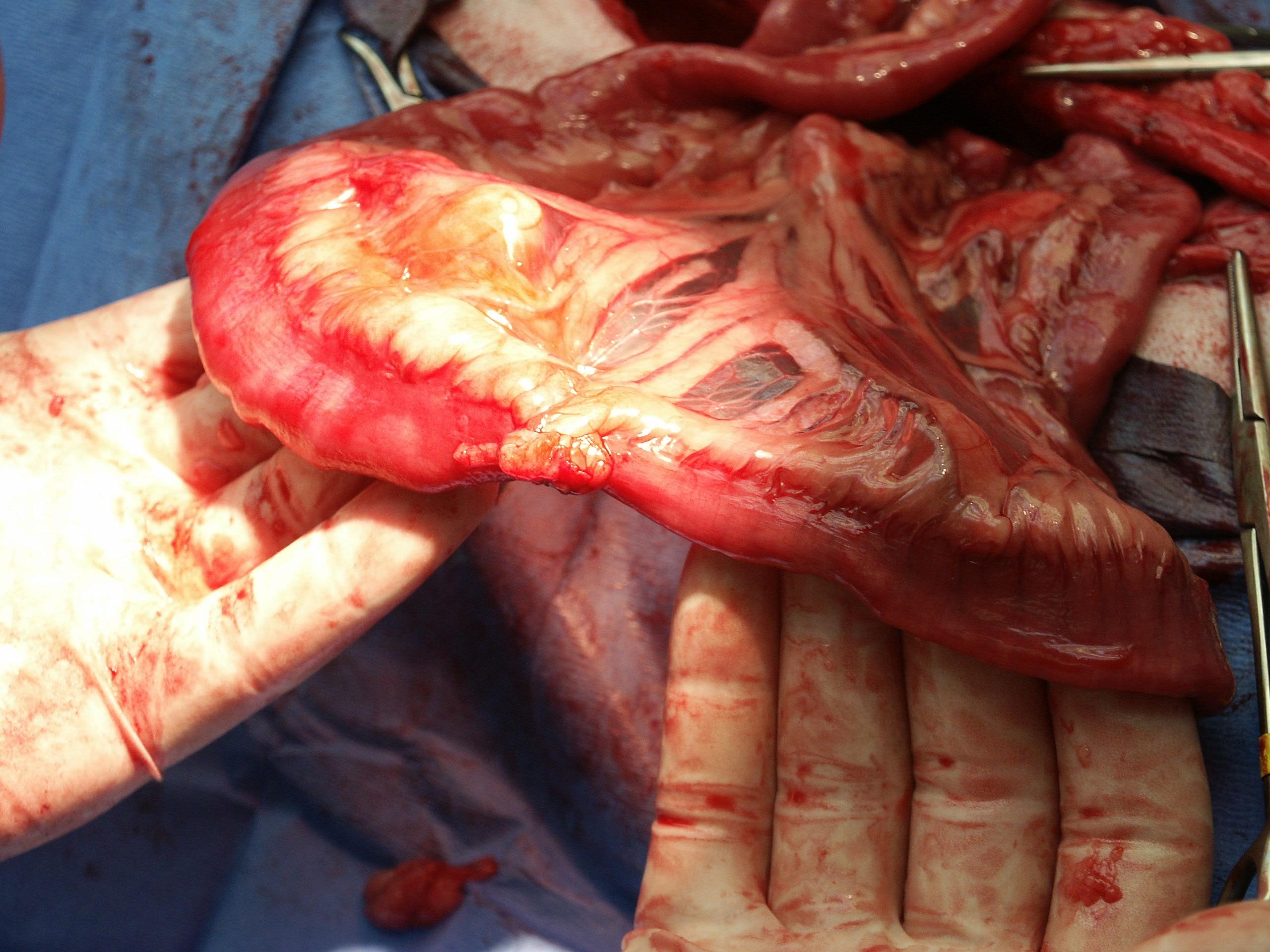 On exploratory laparotomy the intestines were attached to the abdominal wall creating a stricture (see photo) but a GI foreign body could not be found. Liberating the adhesion was enough to restore function and the patient recovered uneventfully.