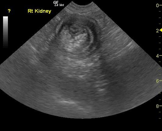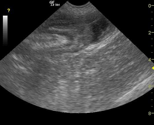 A 10 year-old MN Shepherd mixed dog presented with a 2-3 month history of intermittent vomiting and a more recent anorexia. Abnormalities on physical examination were dehydration and a 3 cm firm left anal sac mass. The only significant finding on CBC and serum biochemistry was hypoalbuminemia. Survey radiographs showed no evidence of pulmonary metastases but revealed excessive pyloric gas pattern with a volume contracted heart.