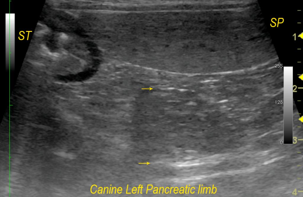 A consistently systematic approach to every sonogram is essential for the clinical sonographer to ensure that all lesions and normal presentations are visualized, imaged, and captured electronically for review. At SonoPath we always start at the urinary bladder and pelvic urethra in every animal, since pathology usually does not cause discomfort in this region (urinary tract obstruction excluded). This way we may gauge how the patient reacts to the scanning hand and then, when progressing counterclockwise to the cranial abdomen. With this approach we will have imaged half of the patient prior to scanning organ systems and regions that often host painful pathology such as is seen with pancreatitis, gastritis, cholecystitis and paralumbar spasm at the T-L junction. This approach minimizes the time required to scan a restless or agitated patient and allows the sonographer to detect pain from the patient as they react to the scanning hand when compared to how they react in the painless caudal abdomen.