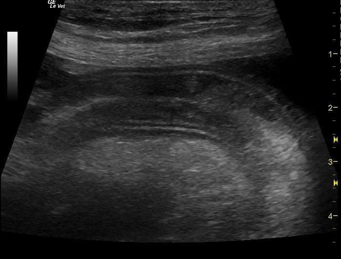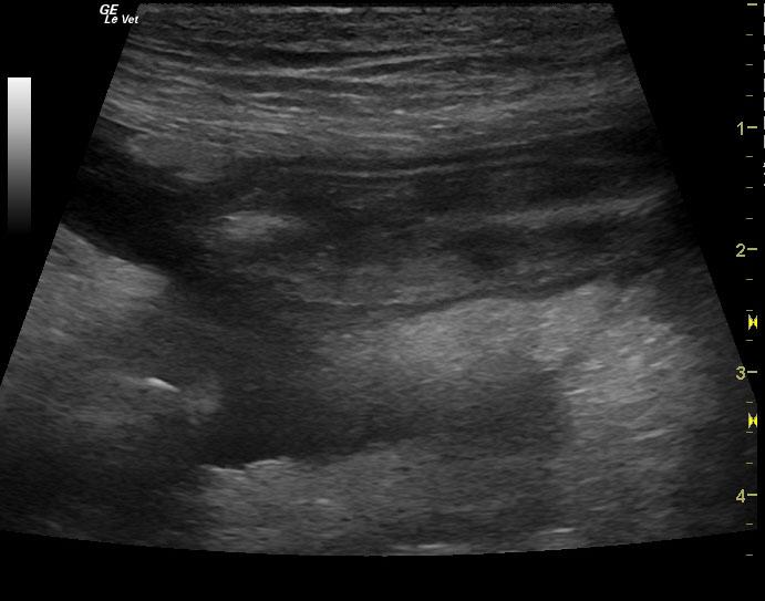 A 6-year-old female spayed Hound mix dog was presented for decreased appetite, increased drinking, and watery diarrhea for 4 days. Physical exam found soft, fluid filled bowels on abdominal palpation. An anti-diarrheal injection was administered, and the patient was discharged with oral anti-diarrheal medication, along with Tylan powder. Approximately 1 week later, the patient presented for persistent decreased appetite, lethargy, and watery stool. Physical exam found patient bright and alert, with pink mucous membranes, normal CRT, heart and lungs clear, a slightly distended abdomen, and no palpable masses found. Blood chemistry revealed hypoproteinemia, hypoalbuminemia, hypocalcemia, and hypocholesterolemia. CBC found high platelet count. Fecal was negative.