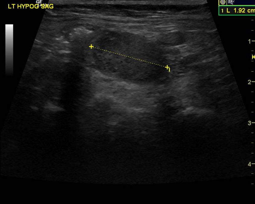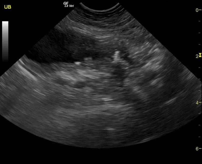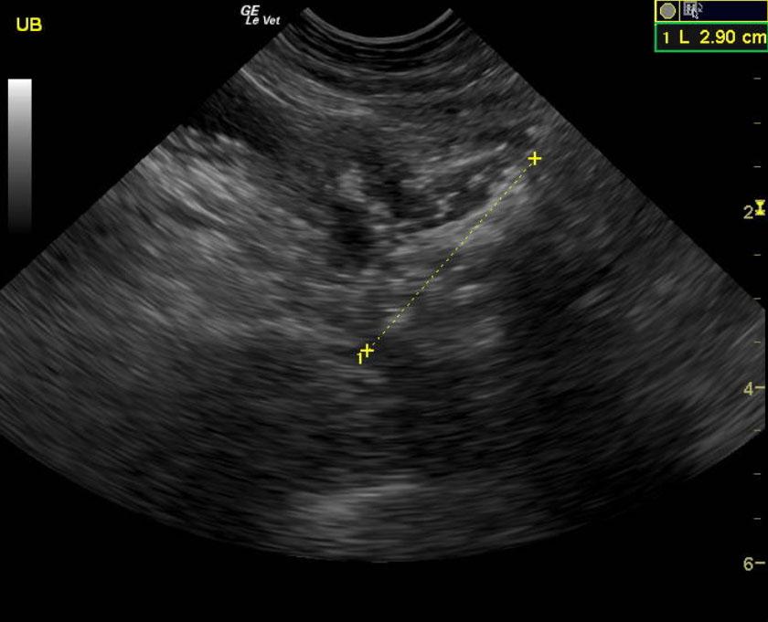 The prostate presented multi focal mineralization with swollen contour with minor polypoid changes and hyperechoic surrounding fat. This projected into the trigone. The mineralizing, prostatic mass measured 2.9 cm and infiltrated into the preprostatic urethra and likely post prostatic urethra. Iliac lymphadenopathy was noted.