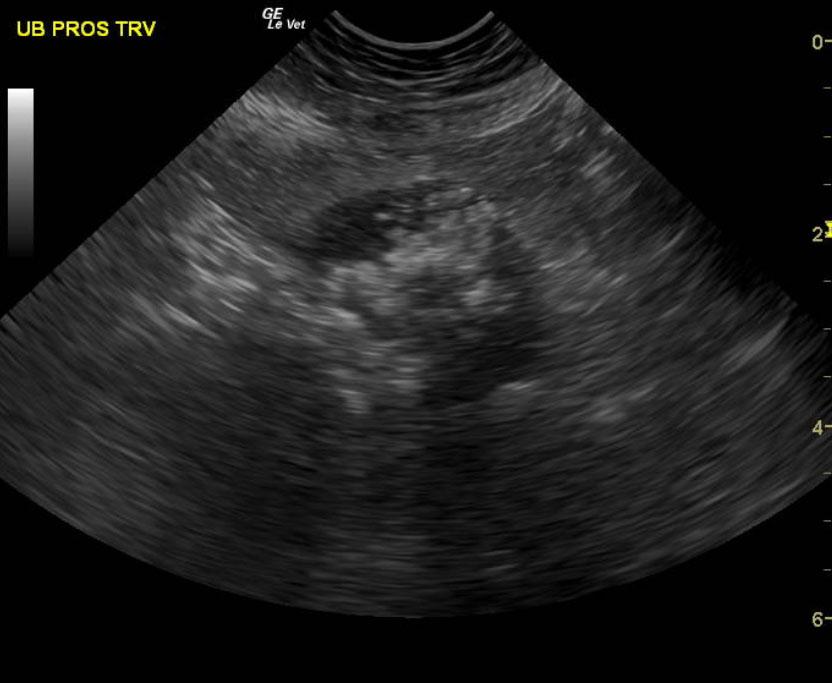 An 11-year-old neutered male Pomeranian dog was presented for evaluation of tenesmus, “hunched” stance, and decreased energy. On physical examination, a 3cm palpable mass cranial to pelvic canal was noted. Survey radiographs showed a mineralization/spherical mass in area of the prostate.