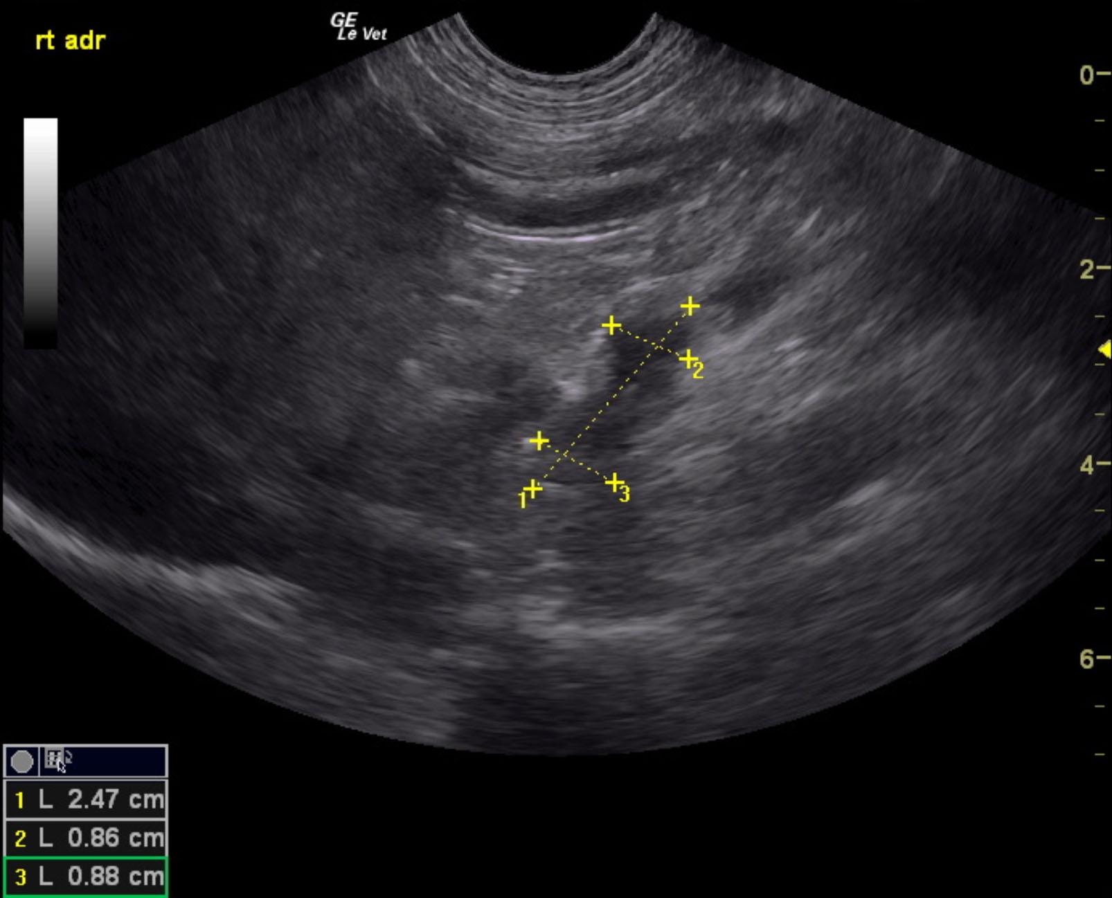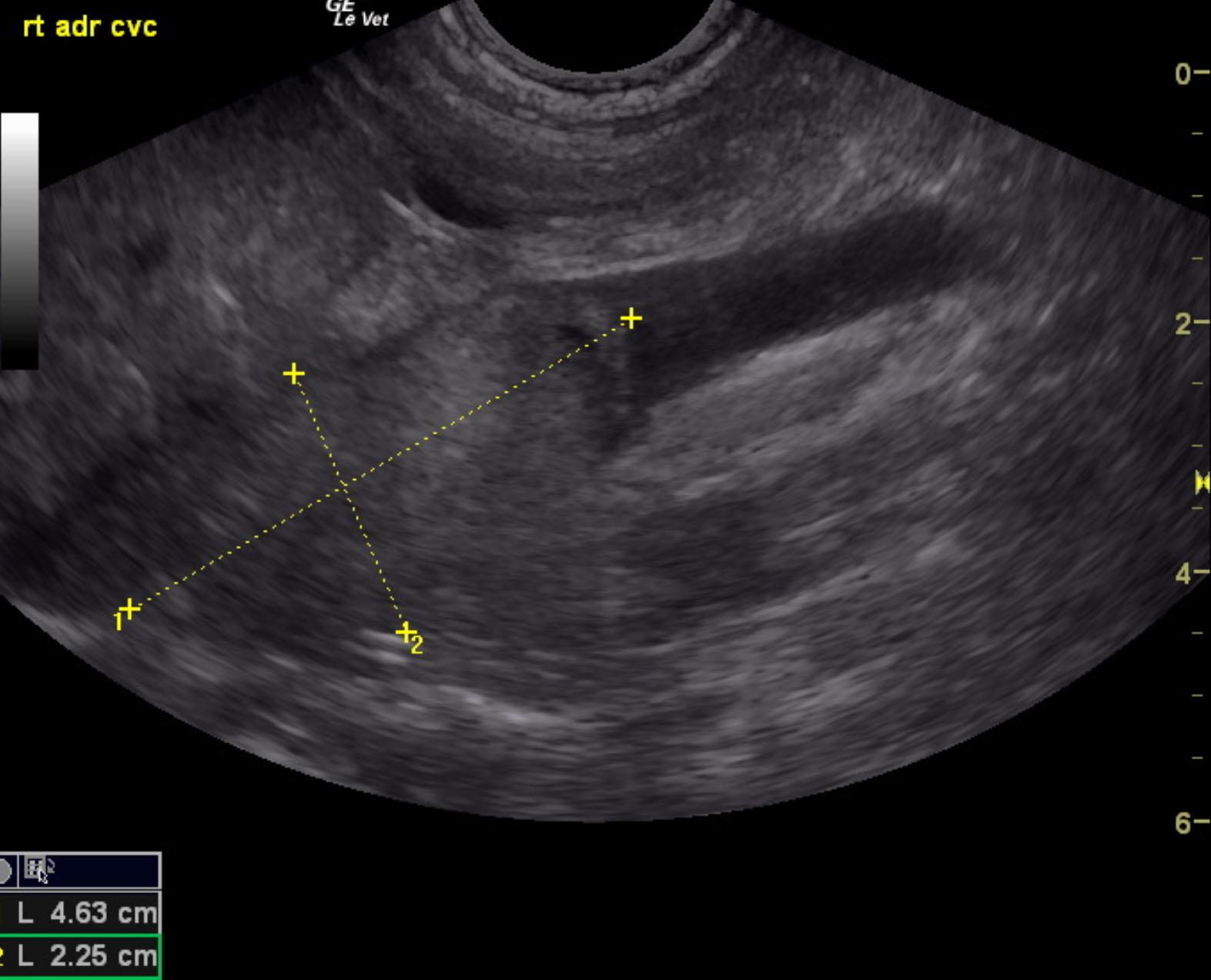 Right adrenal mass with invasion into caudal vena cava in a 12 year old MN Corgi