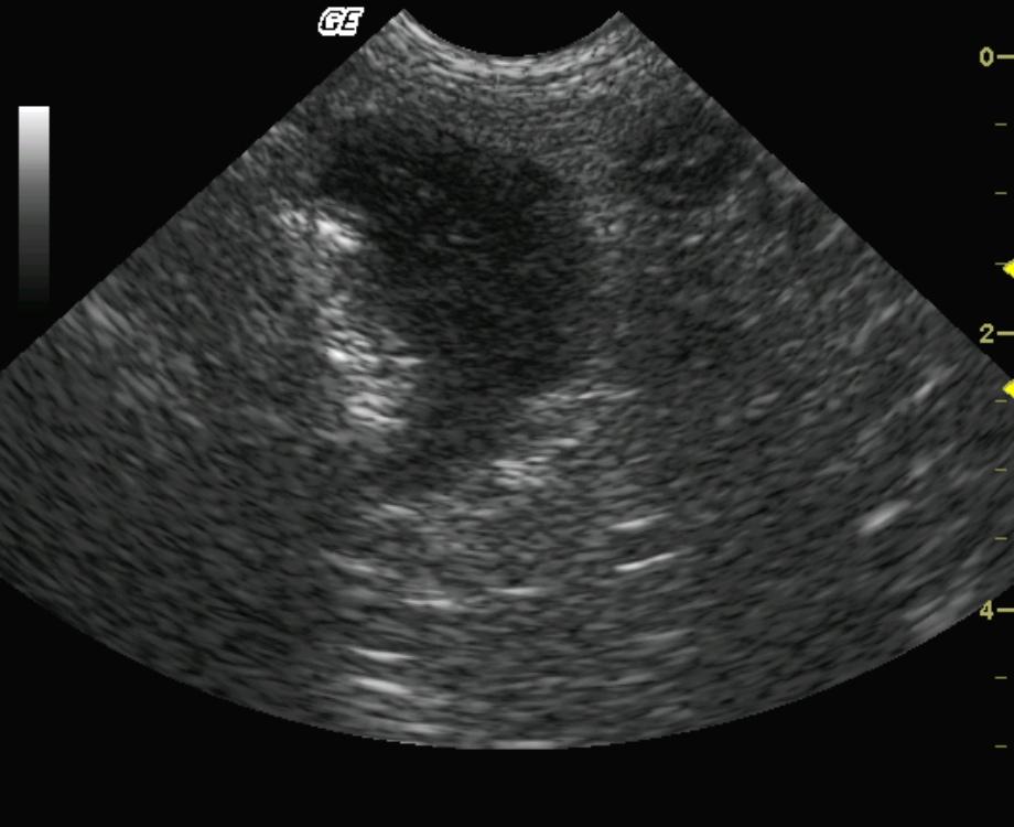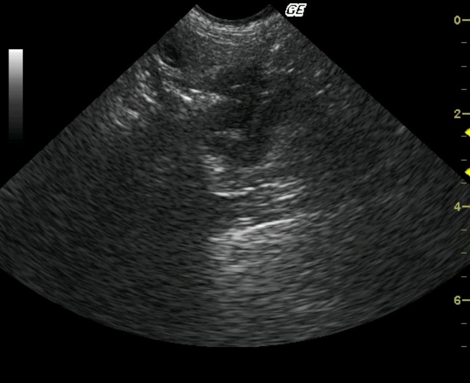 This 15-year-old FS Shepherd cross was presented for abdominal guarding, mild lethargy and partial anorexia. The blood analysis revealed mildly elevated BUN and mildly elevated ALT.