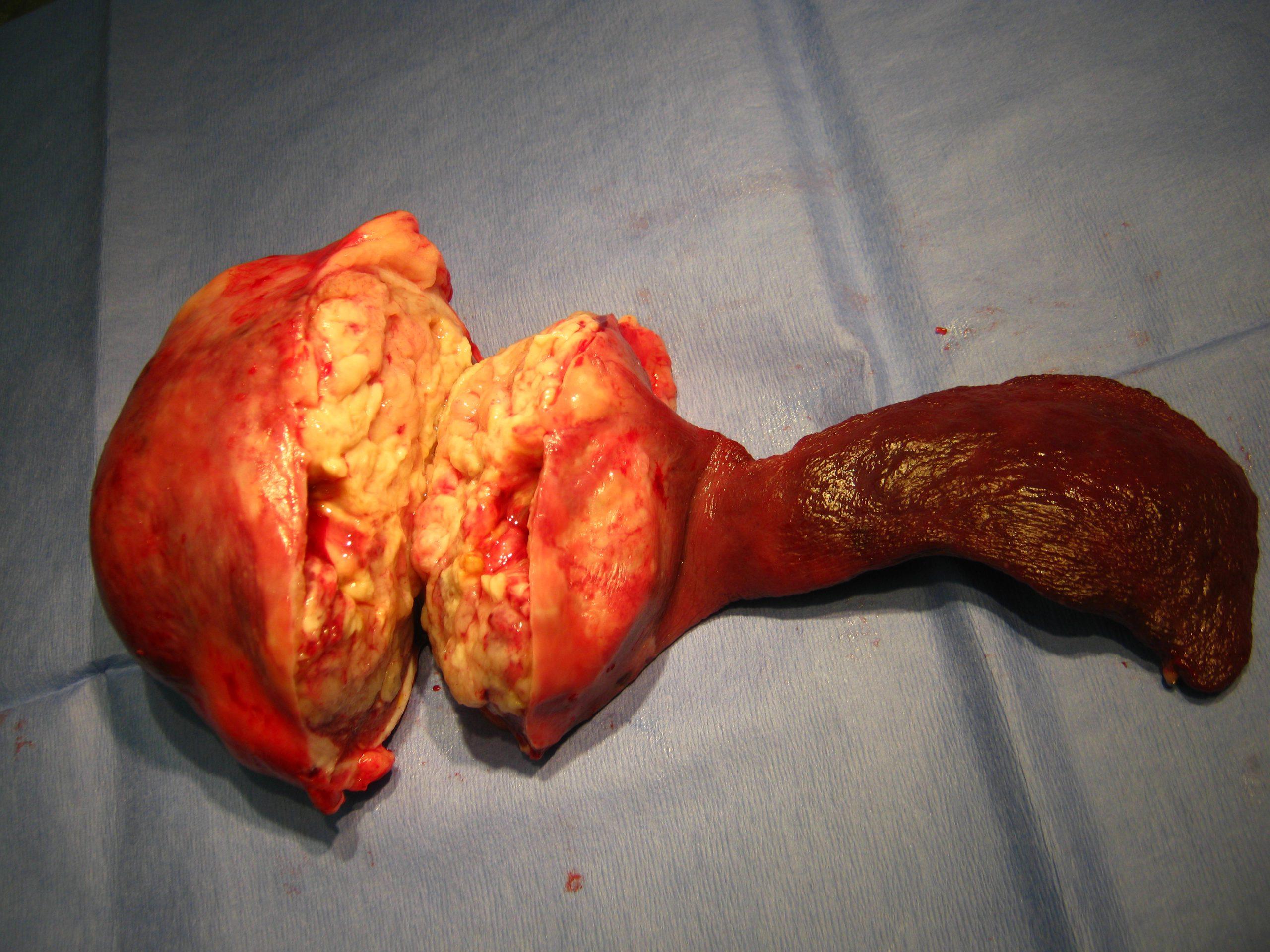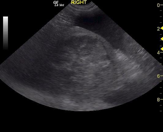 A 12-year-old spayed female Sheltie dog with a history of poor appetite over a few weeks was presented for evaluation of anorexia, lethargy, and diarrhea. Abnormalities on physical examination included dehydration, slight polypnea, and possible ascites with a non-tender abdomen. Abnormalities on CBC and serum biochemistry included leukocytosis, azotemia, and hyperkalemia.