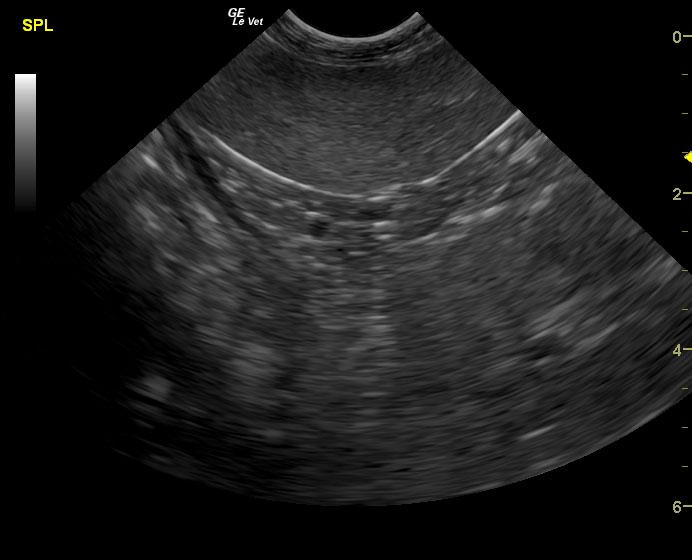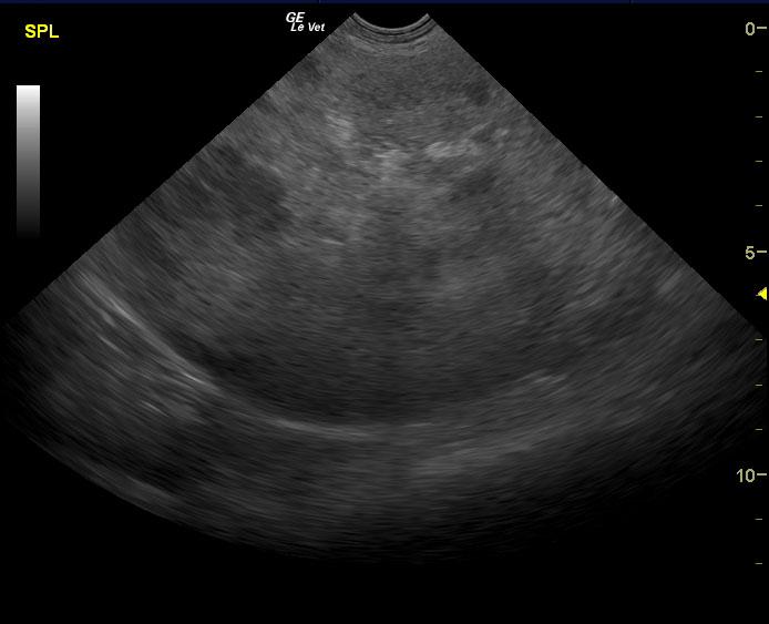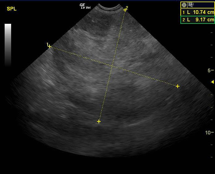 A 14-year-old SF Chow mix was presented for evaluation of weakness, which had also been present a week ago. On physical examination, a palpable abdominal mass was present. Severe non-regenerative anemia and hypoalbuminemia were present on CBC and blood chemistry.