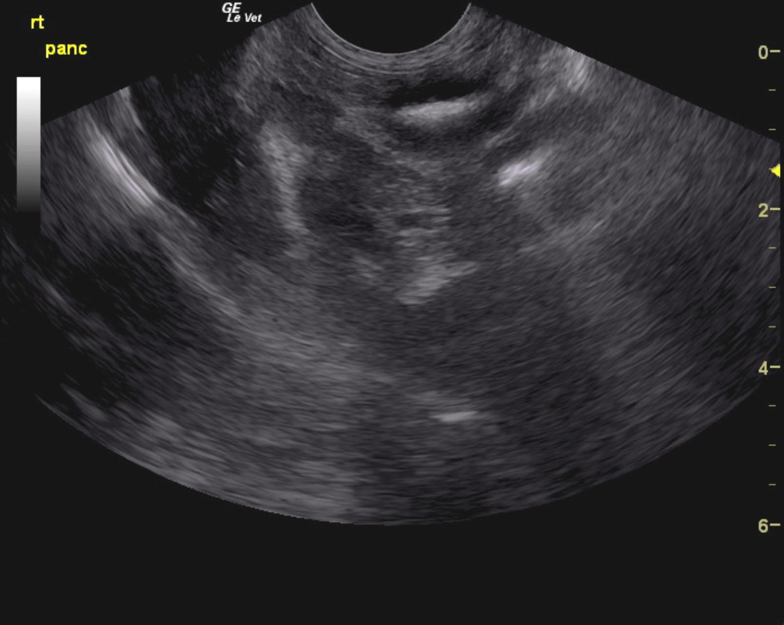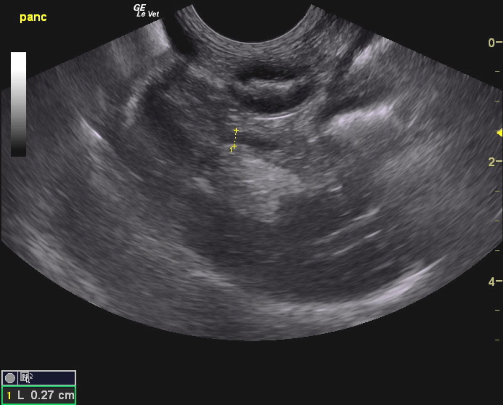 The right limb of the pancreas was irregular with mixed hypoechoic changes and swollen, distinct, hypoechoic differentiation from the surrounding fat and mesentery. The pancreatic duct was dilated at 0.26 cm.