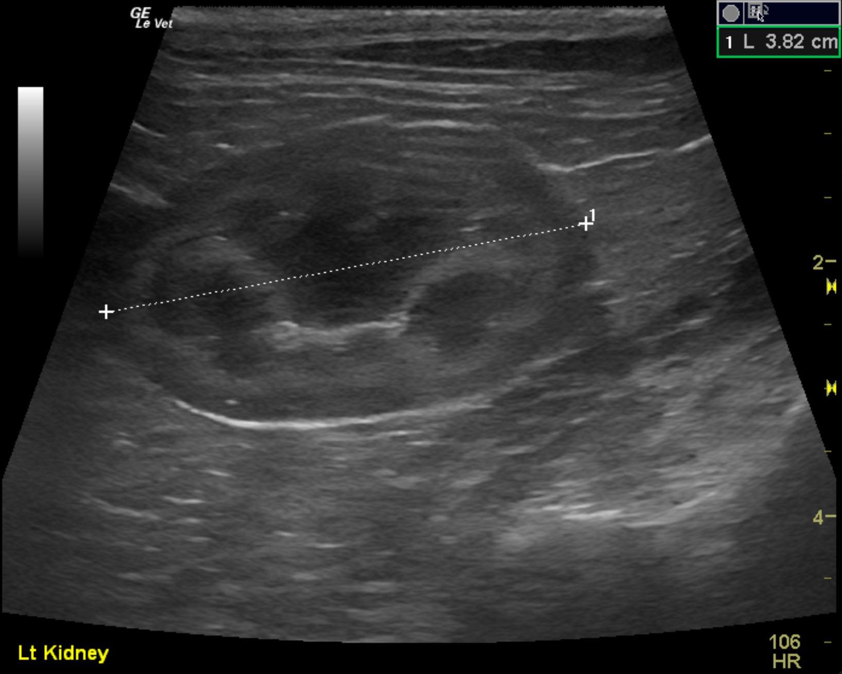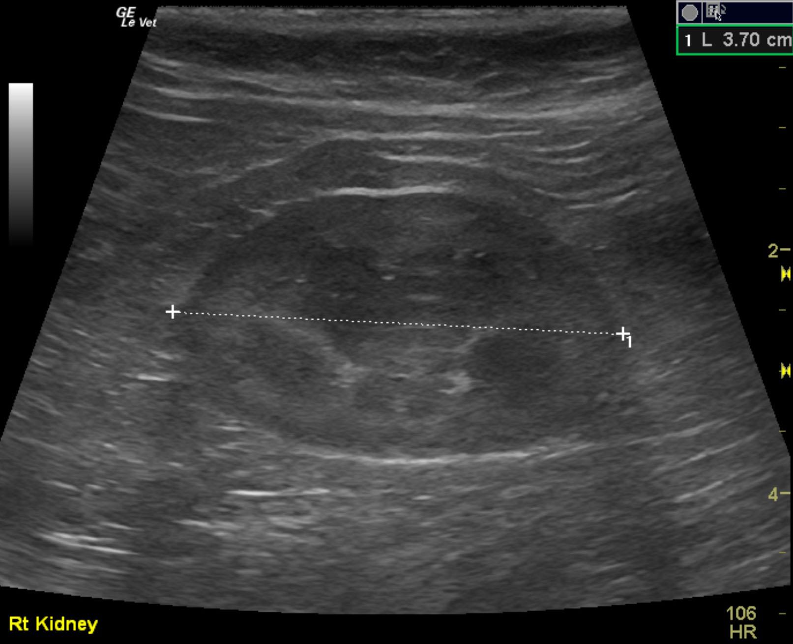 The kidneys revealed normal size and structure, corticomedullary definition and ratio (cortex 1/3 of medulla). The cortices presented largely uniform texture with normal echogenic relationship to liver and spleen. Medullary echogenicity differed distinctly from that of the cortex and no evidence or dilation could be seen. The capsules were acceptably uniform without dramatic irregularities. The right kidney measured 3.7 cm. The left kidney measured 3.82 cm.