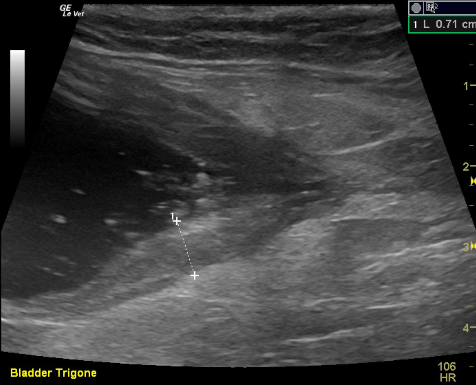 The urinary bladder in this patient presented a concentric thickening of the trigone and ventral cystourethral junction continuing into the urethra. The bladder measured 0.71 cm with echogenic debris. Significant, periserosal inflammatory pattern was noted. A minor amount of sand and debris was noted in the urinary bladder with suspended debris as well. The apex of the bladder appeared unremarkable. The mural pathology appears to be concentrated in the cystourethral junction and ventral and dorsal caudal aspects of the bladder.