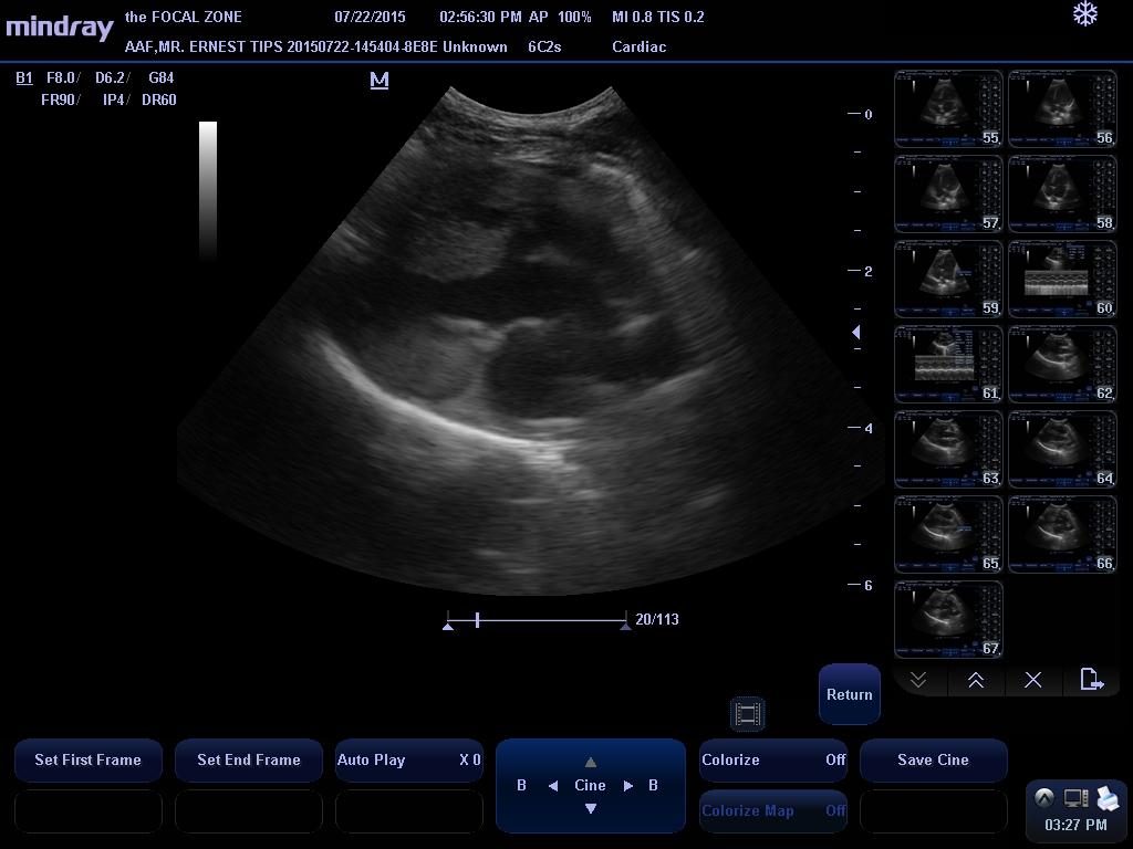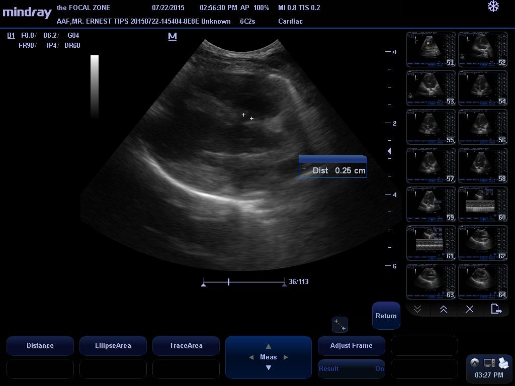 This examination demonstrates a small left to right shunting perimembranous ventricular septal defect with very mild left heart volume overload. The clinical significance of VSDs are dependent on the size of the defect and resistance to flow, which is related to the left and right ventricular systolic pressures. With small defects, there is a high resistance to systolic flow, and thus, there is only a small amount of blood that shunts through the defect, whereas with larger defects, there is a significant amount of shunting that can eventually lead to left-sided congestive heart failure and even shunt reversal if secondary pulmonary hypertension develops. This patient’s VSD appears to be small, and more importantly, his shunt velocity is consistent with a restrictive defect, indicating that the small size of the detect provides high resistance to flow, so that while his murmur is very loud, there is actually only a small volume of blood shunting from the left ventricle to the right ventricle (the loud murmur is caused by the blood squeezing through a small opening). Given the presence of a restrictive defect, it is possible that the VSD may never become clinically relevant, though the presence of mild left heart dilation suggests that his disease must be monitored carefully over time.