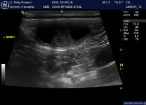 Looks like cystic ovaries and early pyometra to me and juvenile or reactive LN. OVH if not intended for breeding.