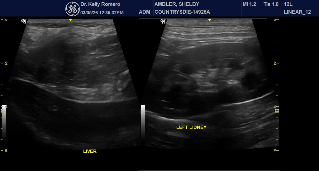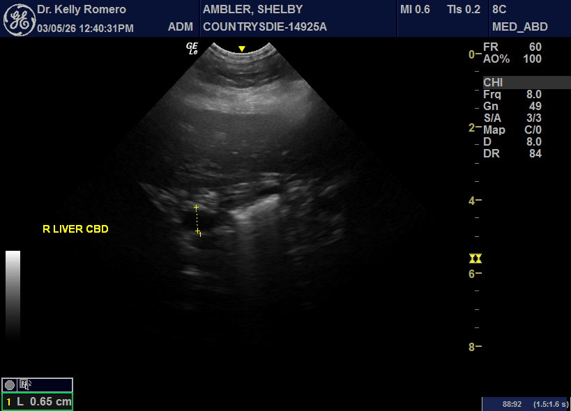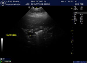 7 year 9 month old FS Chow with lethargy, vomiting and intermittently dribbling blood tinged urine. CBC WNL. Chem – ALT 773, ALP 389, GGT 31, T bili 0.5. Looks like choleliths in biliary tree, but focal region. No reported fever. Started Ursodiol, Denamarin, and antibiotics for cholangiohepatitis (Clavamox and metrondizadole). Urinary bladder looked unremarkable. There was a hyperechoic nodule in the otherwise normal left adrenal gland.