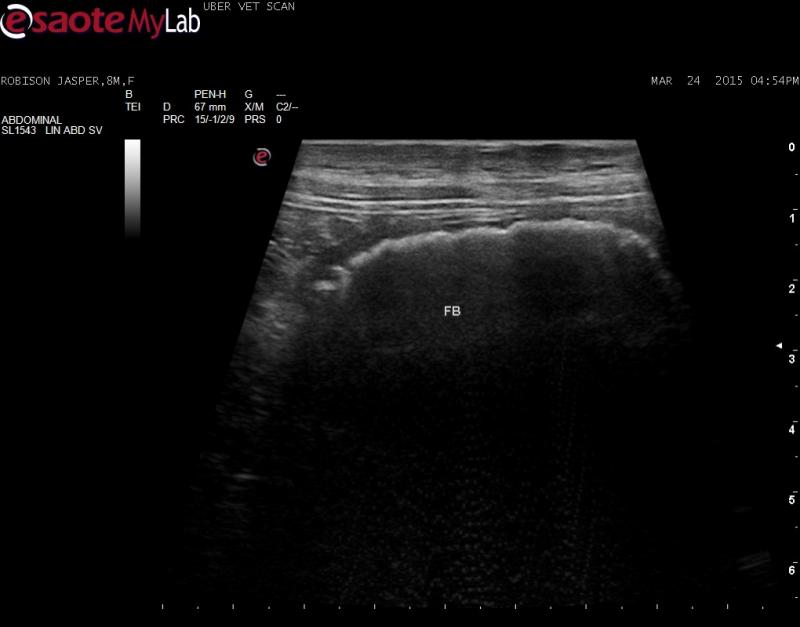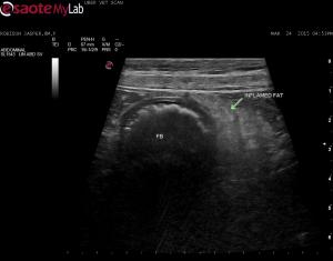 I believe there is a GI FB present in the SI; the stomach had a small amount of fluid in it, duodenum was normal. Strongly shadowing object found in loop of SI with surrounding hyperechoic fat. I have recommended surgery, but just want an opinion to confirm my findings – always afraid I am looking at the colon, but this looks like SI to me