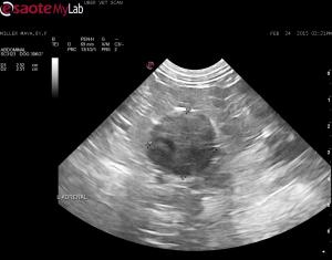 Description: An adrenal mass is suspected when the maximum width of the adrenal gland exceeds 1.5 cm, there is loss of normal architecture or shape, or the shape or size between the affected adrenal gland and the contralateral gland is asymmetrical. The latter comprise the initial criteria for diagnosis; however, a bulbous enlargement of the cranial or caudal pole of the adrenal gland is common in dogs with no adrenal pathology and can be misinterpreted as an adrenal mass. If the suspected mass is not precipitating obvious signs (i.e., aggressive behavior), then an abdominal ultrasound should be repeated to confirm that the mass is a consistent finding before pursuing further diagnostics or surgery. Large breeds (Poodles, German Shepherds, Retrievers, and Terriers) and females appear to be overrepresented in the clinical reviews of adrenal tumors. Adrenal tumors in cats are rare and insufficient information exists to characterize the disease.