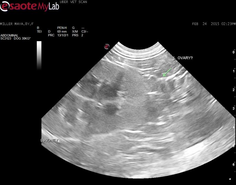 – I could not find a uterus or right ovary but found a structure caudal the left kidney that may be a left ovary?