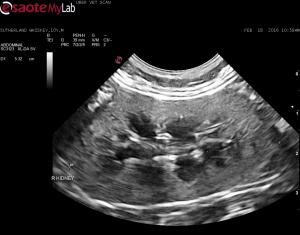 – kidneys are bilaterally enlarged (over 5cm) with hyperechoic coritices when compared to spleen but I don’t think they look abnormal otherwise and I have seen hyperechoic cortices in cats alot without disease  (fat)